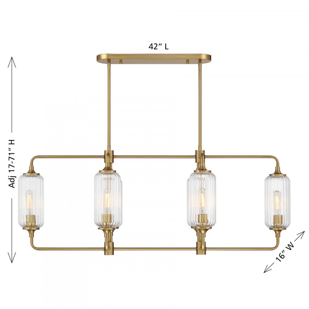 The Savoy House Holton 6-light linear chandelier showcases an inventive and geometric style with tall, rounded shades of clear ribbed glass and a slim, rounded structure finished in Warm Brass. It will bring a big dose of style to any space! Holton is 42" in length, 16" in width and has an adjustable height ranging from 17" to 71". It uses six standard size bulbs of up to 60 watts per bulb. Bulbs not included. Comes with eight 12" downrods and two 6" downrods.