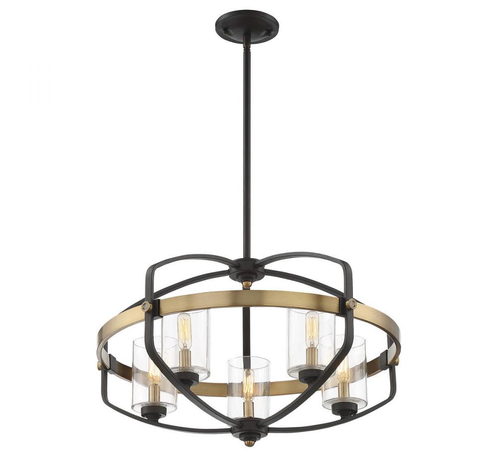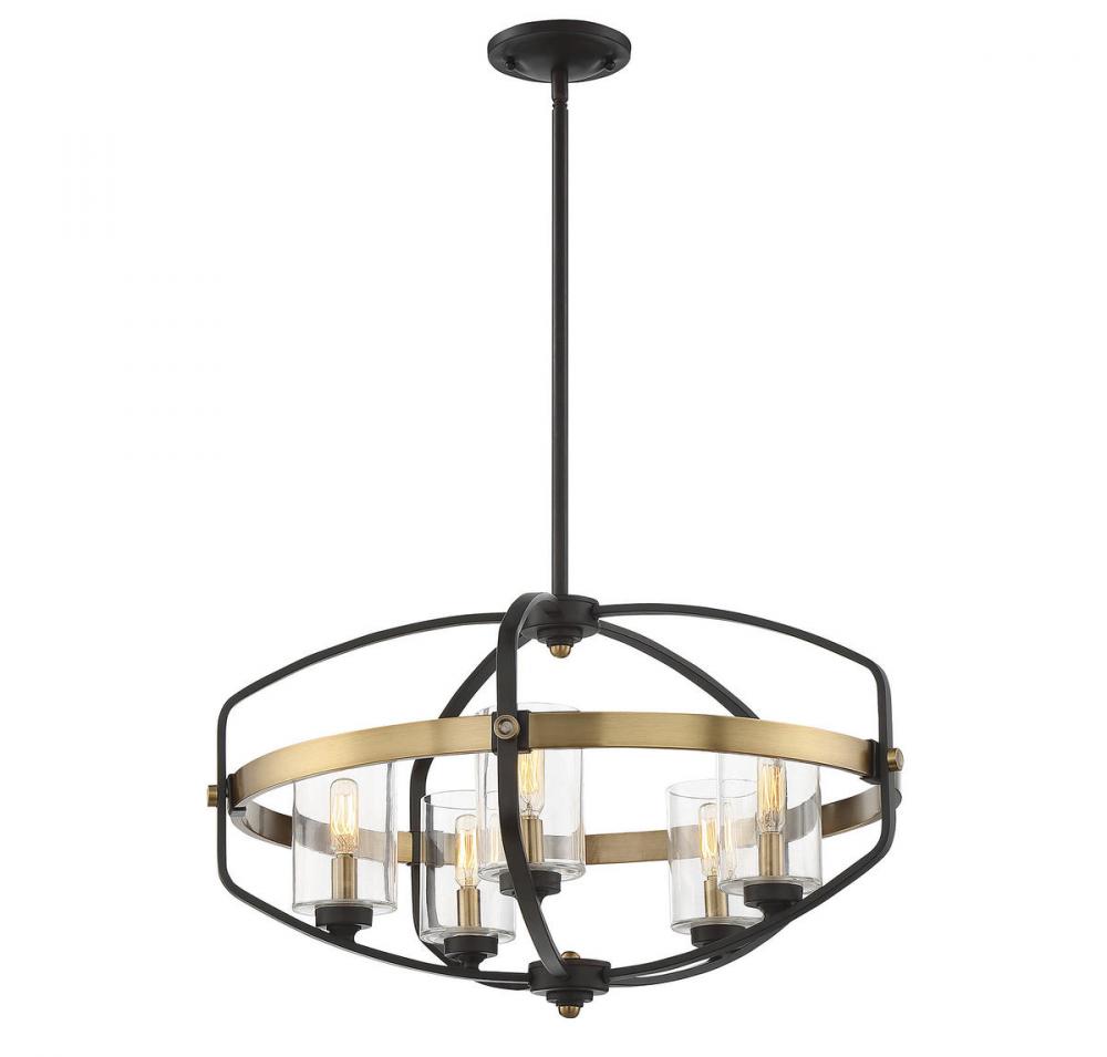 The Savoy House Kirkland 5-light pendant offers edgy, architectural style that is perfect for today's fashionable interiors. Its English bronze finish is accentuated by touches of warm brass for two-tone allure. Pendants are extremely versatile and can fit in many different spaces, such as kitchens, family rooms, great rooms, foyers, entryways, offices, bedrooms and bathrooms. This pendant can be hung on a sloped ceiling, too. Since the bulbs are exposed, try using stylized bulbs (not included) like tubular shape or Edison style for a different look! Kirkland can pair with hardware finished in black or brass, but you can also mix it with hardware in other finishes. It is great for rooms with industrial, transitional or contemporary design touches. When you choose a Savoy House lighting fixture, you can be certain you’ve selected a piece that will withstand the test of time.