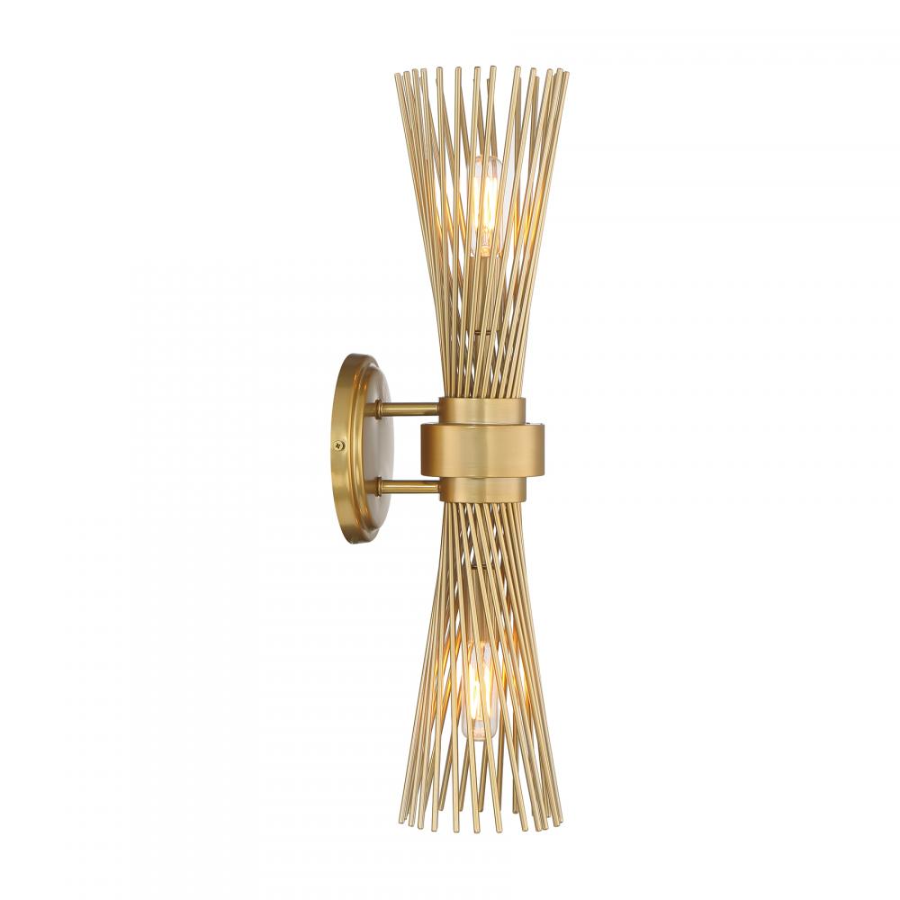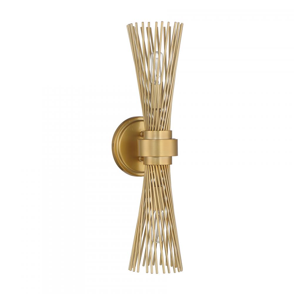 The Savoy House Longfellow 2-light sconce showcases a fashionable style with metal rods that are gathered together at the center and unfurl outward. When the lights are on, it creates a dramatic glow that is sure to catch the eye. Burnished Brass finish. Longfellow is 20" in height, 5.12" in width and extends 6" from the wall. Uses two candelabra size bulbs of up to 60 watts per bulb. Bulbs not included. Damp area rated.