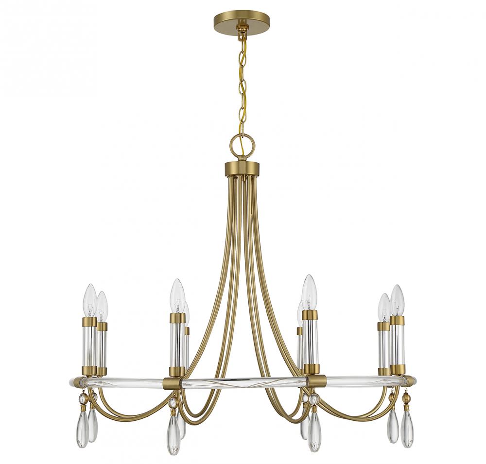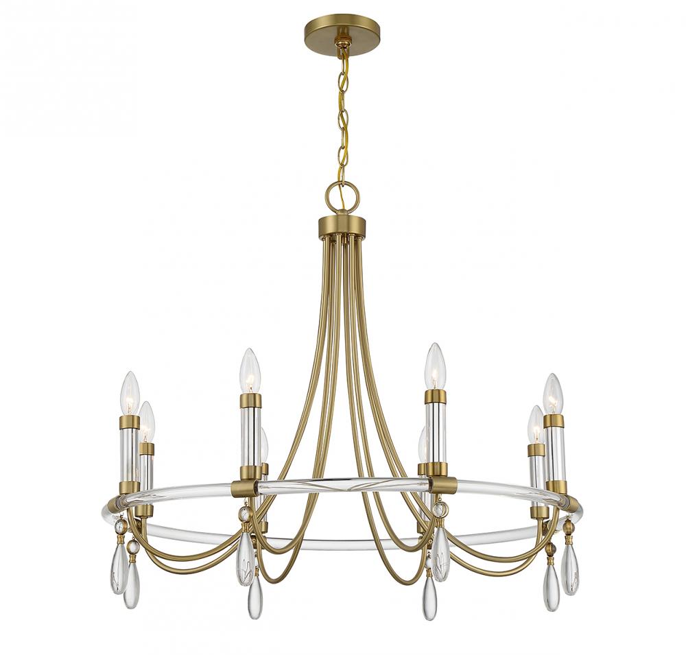 Get a unique mixed-metal take on lighting with this Savoy House Mayfair 8-light chandelier! Its central ring crafted from acrylic, long crystal drops and warm brass finish combine to create a true conversation starter. Mayfair is 27" in height and 30" in width. It uses 8 candelabra size bulbs of up to 60 watts per bulb (bulbs not included). Comes with 120" of chain.