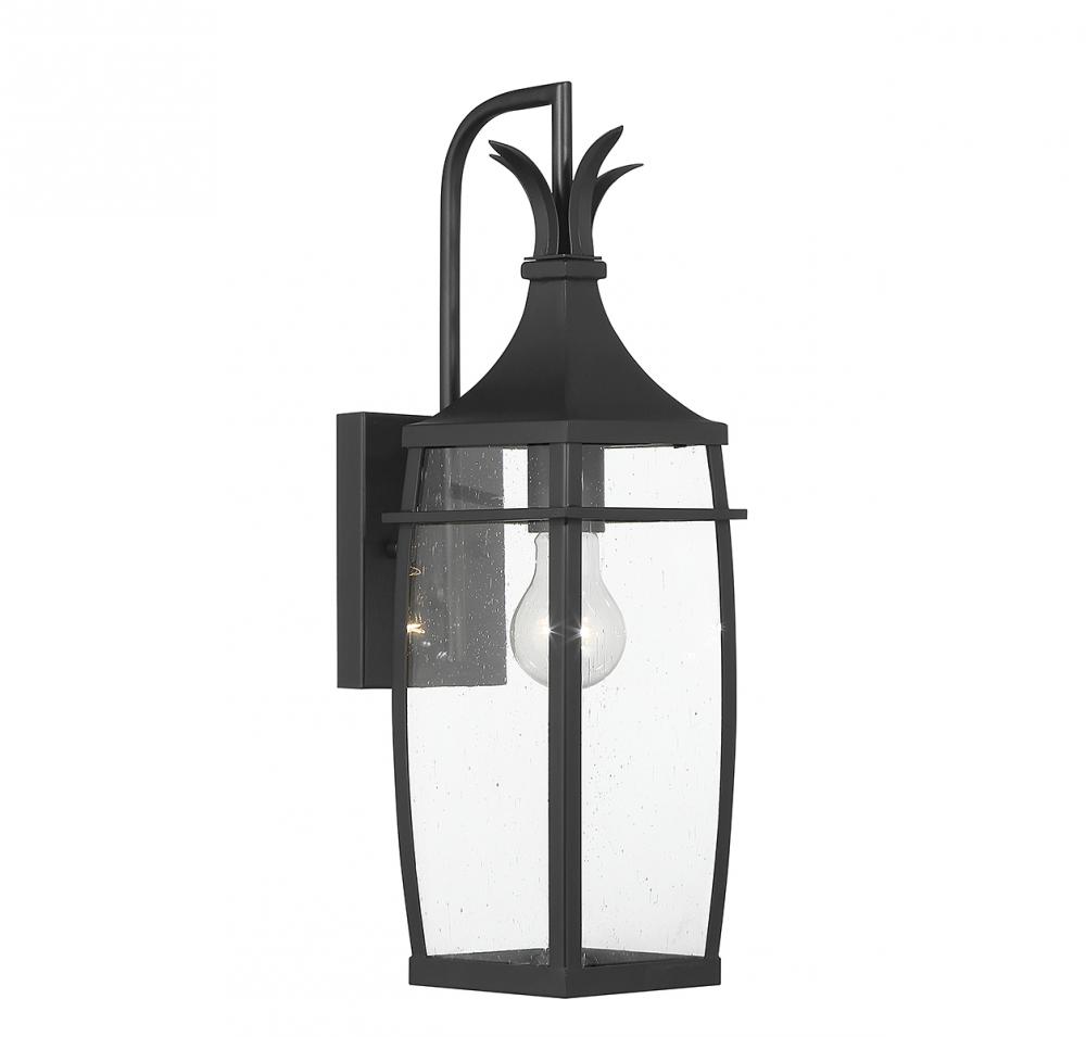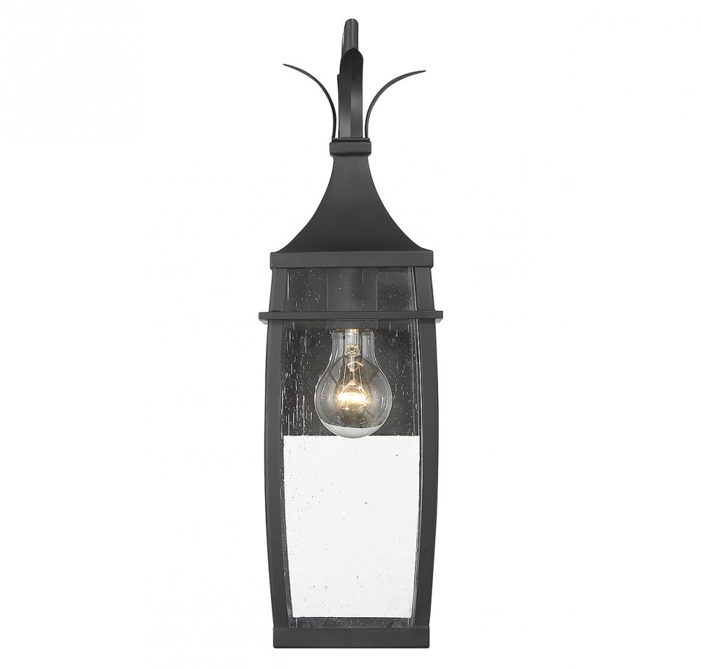 A hint of nature-inspired detailing decorates the top of this Savoy House Montpelier 1-light outdoor wall light. Its slightly curved structure features panes of clear seeded glass and is finished in a classic matte black. Montpelier is 18.5" in height, 5.5" in width and extends 7.5" from the wall. It uses 1 standard size bulb with a max of 60 watts (bulb not included).
