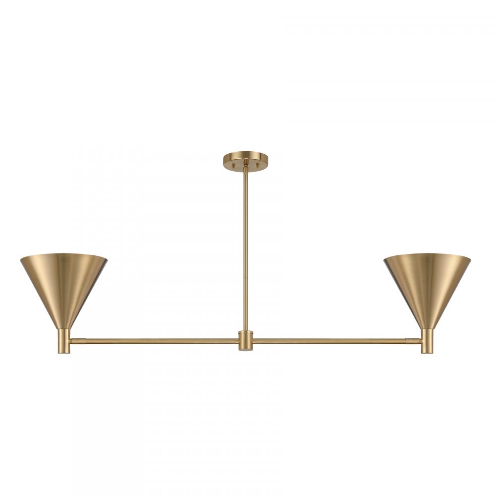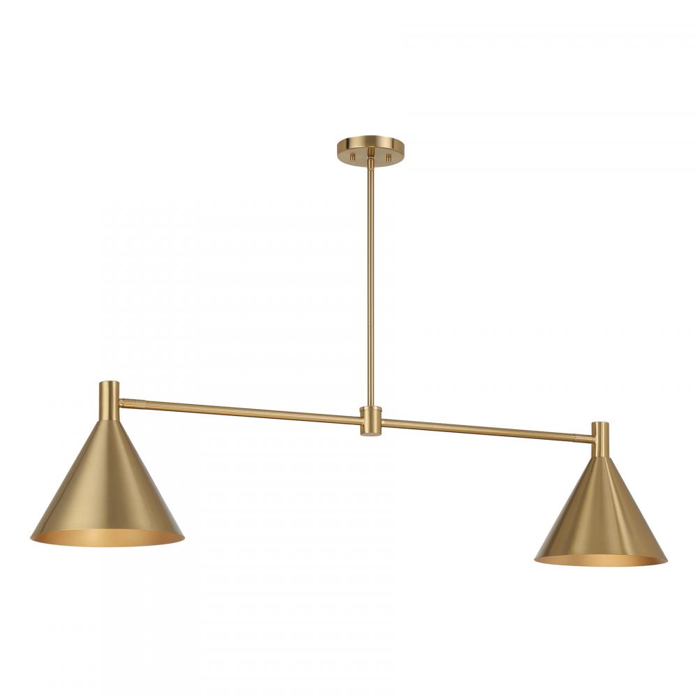 The Savoy House Pharos 2-light linear chandelier is part of Moderne by Breegan Jane, bringing her signature approachable modern luxury style to your home. Breegan loves how metallics elevate a design, as exemplified by the opaque metal shades finished entirely in champagne-toned Noble Brass. The shades can be adjusted, providing different angles of light to meet your needs. Pharos is 50" in length, 10" in width and has an adjustable height ranging from 11" to 65". Comes with four 12" downrods and one 6" downrod. Uses two candelabra size bulbs of up to 60 watts per bulb. Bulbs not included.