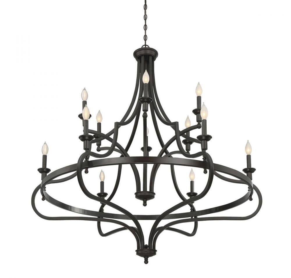 The Savoy House Shields 12-light chandelier starts with a basic hoop structure and transforms it into a beautiful and elegant statement of style. The light arms sweep down from the canopy, make graceful curves over the hoop and gather underneath in the decorative finial for a delightful silhouette. Streamlined candle cups with metal candle covers are perched in two tiers above the hoop and the bold lines of this design are highlighted by the English bronze finish. The frame is open and the lamps are unshaded, creating an airy and casual aesthetic. This fixture measures 48" wide and 50.5" high. Twelve 60W candelabra size bulbs provide abundant illumination. It’s truly a stylish and livable chandelier you’ll enjoy everyday.