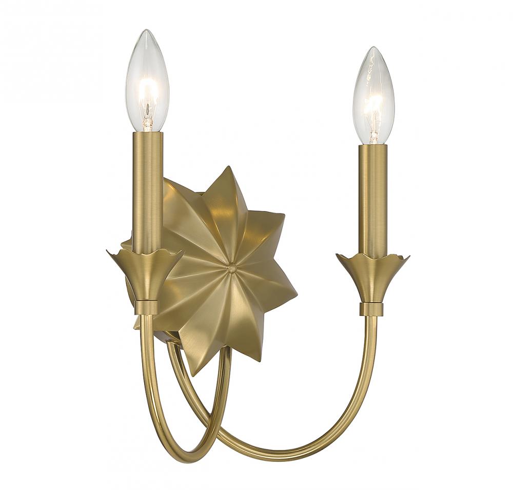 There is beauty in simplicity, as exemplified by this lovely Savoy House Sullivan 2-light wall sconce. It features a bold 8-pointed star and floral bobeche detailing, all finished in warm brass. Sullivan is 9" in height, 10" in width and extends 5" from the wall. It uses 2 candelabra size bulbs with a max of 60 watts per bulb (bulbs not included).
