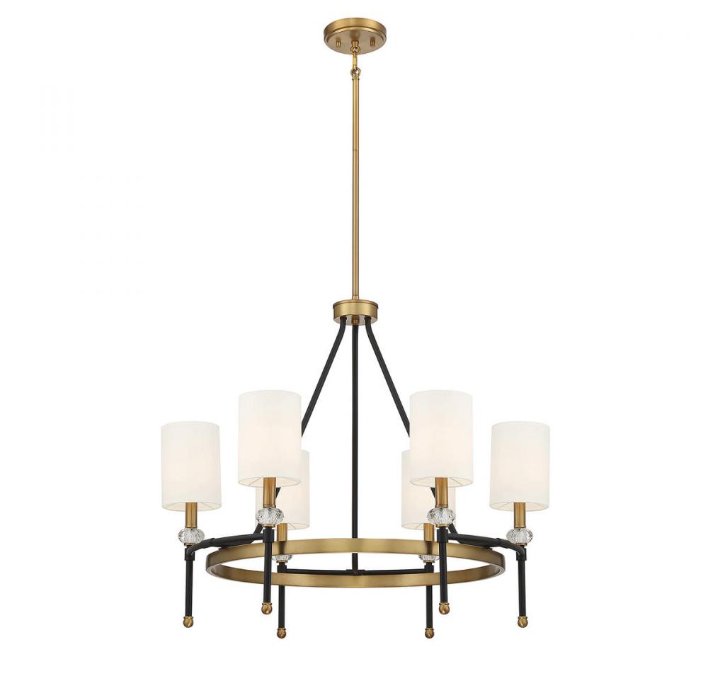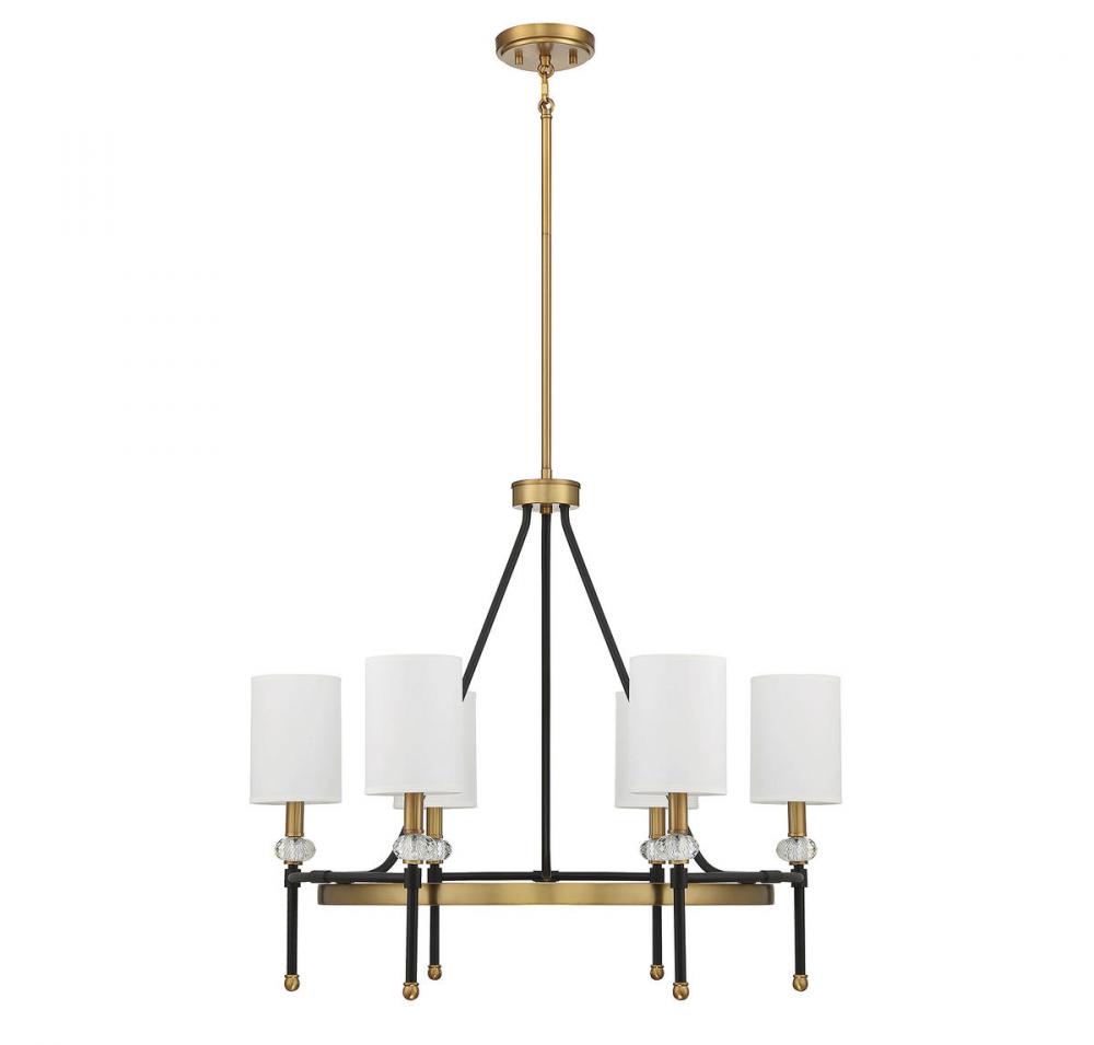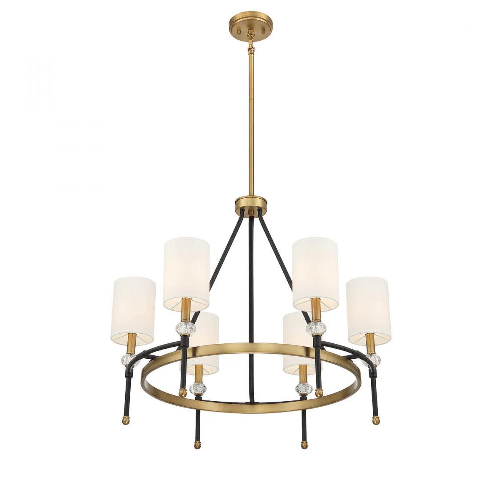 The Savoy House Tivoli 6-light chandelier has a whimsical yet glamorous look that is truly perfect for today's homes. Lights topped with white fabric shades and decorated with faceted crystal baubles decorate an open circular structure that is finished in a beautiful two-tone matte black with warm brass accents. Tivoli is 28" in diameter and has an adjustable height ranging from 30" to 76". It uses six candelabra size bulbs of up to 60 watts per bulb. Comes with four 12" downrods and one 6" downrod, plus 80" of cord.