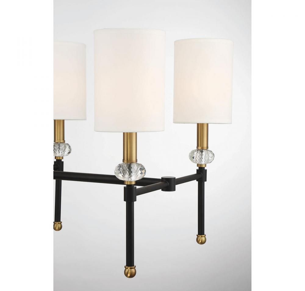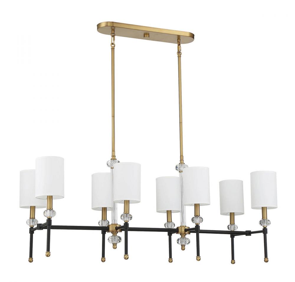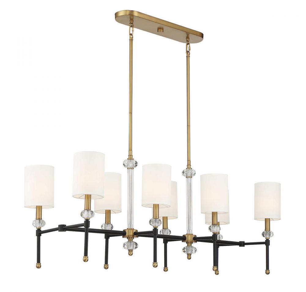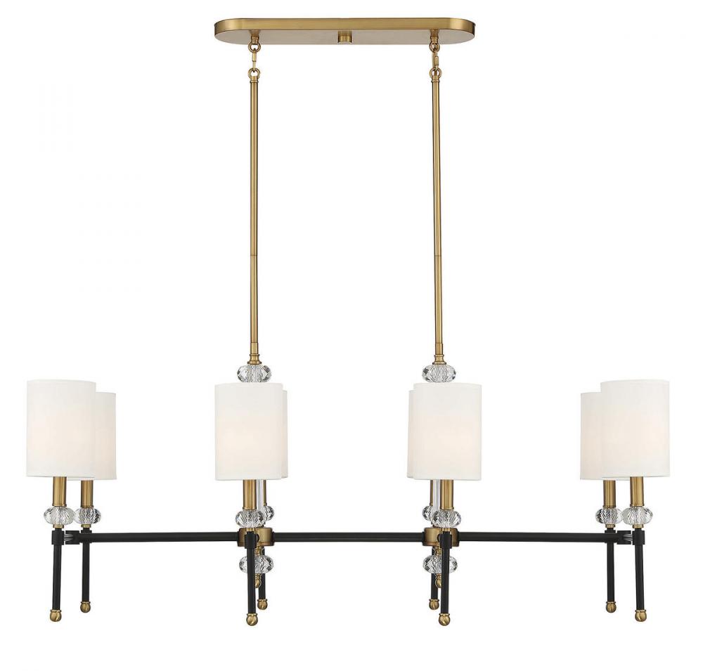 The Savoy House Tivoli 8-light linear chandelier has a whimsical yet glamorous look that is truly perfect for today's homes. Each light is topped with a white fabric shade and decorated with a faceted crystal bauble. Finished in a beautiful two-tone matte black with warm brass accents. Tivoli is 42" in length, 16" in width and has an adjustable height ranging from 22" to 68". It uses eight candelabra size bulbs of up to 60 watts per bulb. Comes with eight 12" downrods and two 6" downrods, plus 80" of cord.