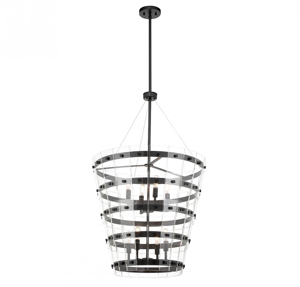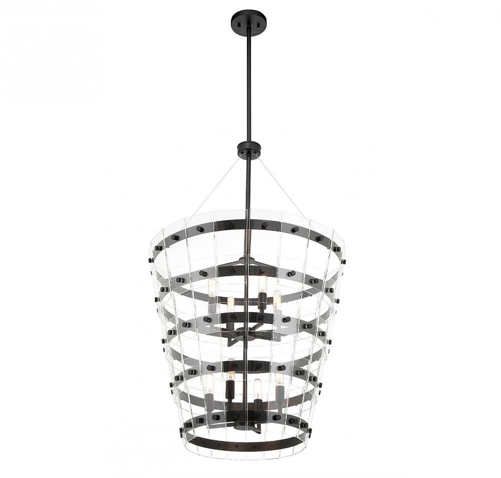 This Savoy House Ventari 8-light pendant is beautifully elegant in its simplicity. Its structure is adorned with slats of clear glass, finished in matte black and appears to be suspended in midair. Ventari is 25" in width and has an adjustable height ranging from 41.5" to 95". Comes with four 12" downrods and one 6" downrod. It uses 8 candelabra size bulbs of up to 60 watts per bulb (bulbs not included).