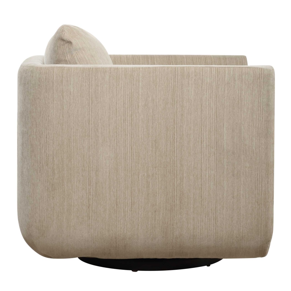 Curves Abound Creating Style And Ease, Featuring A Rounded Frame That Cradles The Base And Rests On A Hidden Swivel. Fully Upholstered In A Rich Textured Chenille In Porcelain.