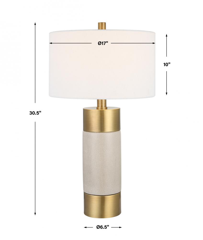 Sophisticated and Versatile, This Table Lamp Displays A Solid Iron Base Finished in Warm Brushed Brass with An Ivory Crackle Glazed Ceramic Center. The Hardback Drum Shade is Covered in A White Cotton Fabric.