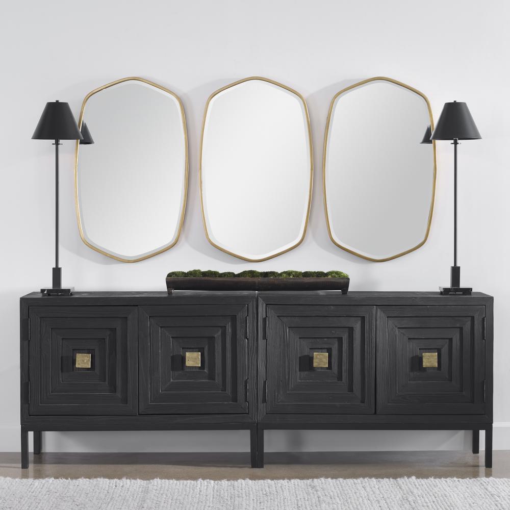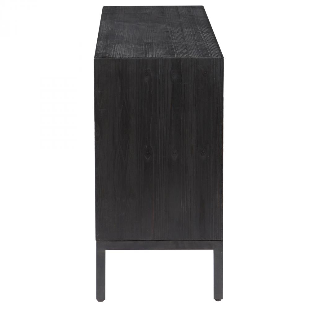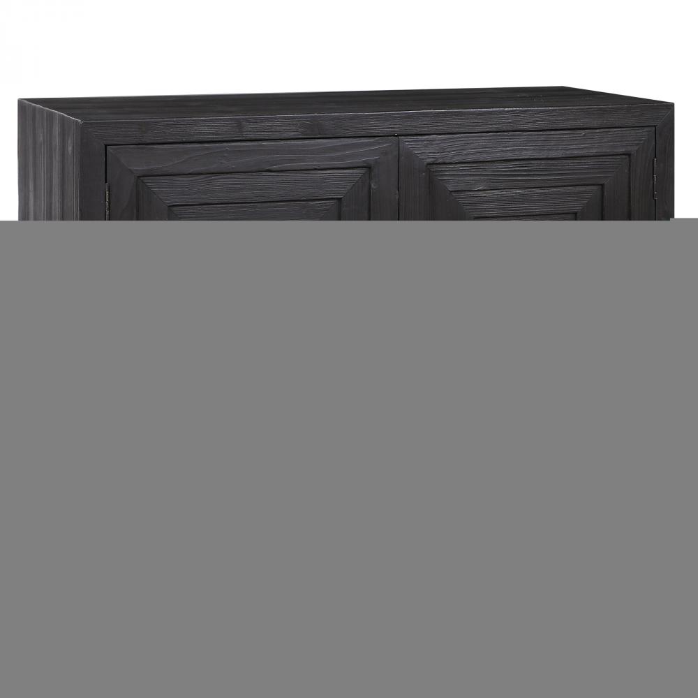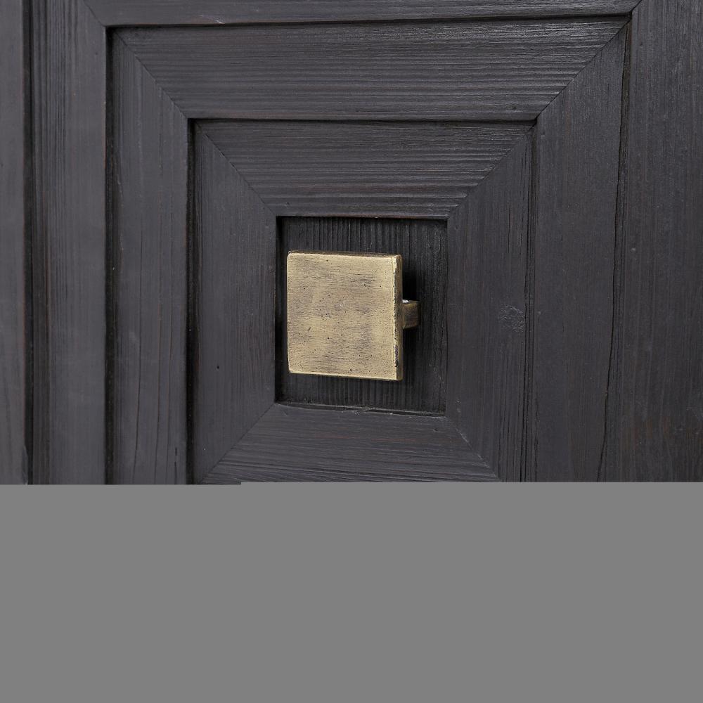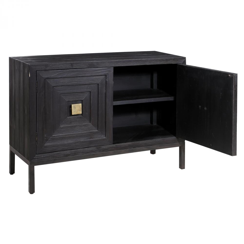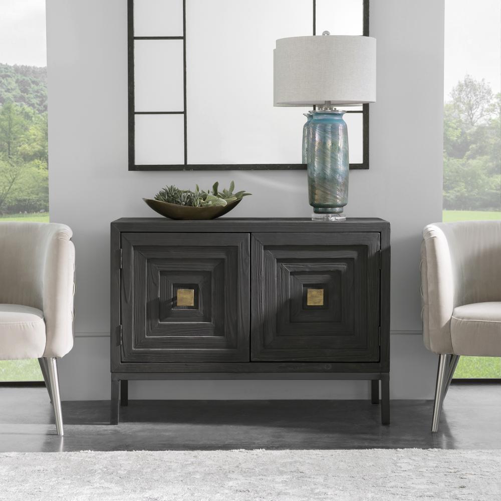 A Contemporary Geometric Two Door Accent Cabinet, Constructed From Deeply Grained Fir Wood Finished in A Dark Ebony Stain, Accented with Brushed Brass Hardware. Has One Fixed Interior Shelf.