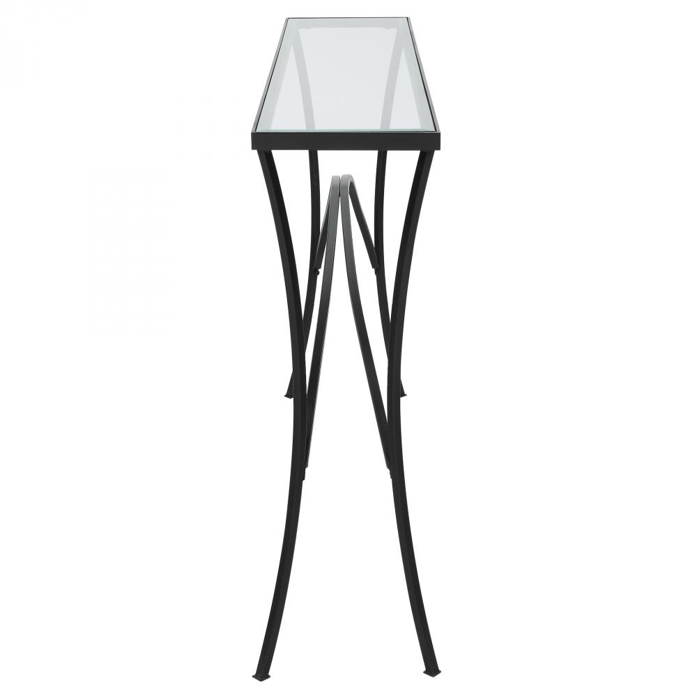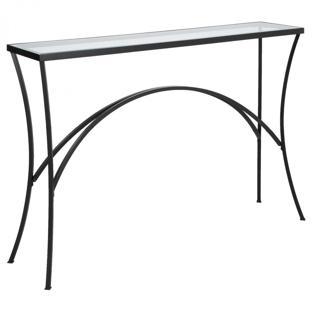 Gracefully Arched Hand Forged Metal Finished in Sleek Satin Black. Top is Clear Beveled Tempered Glass.