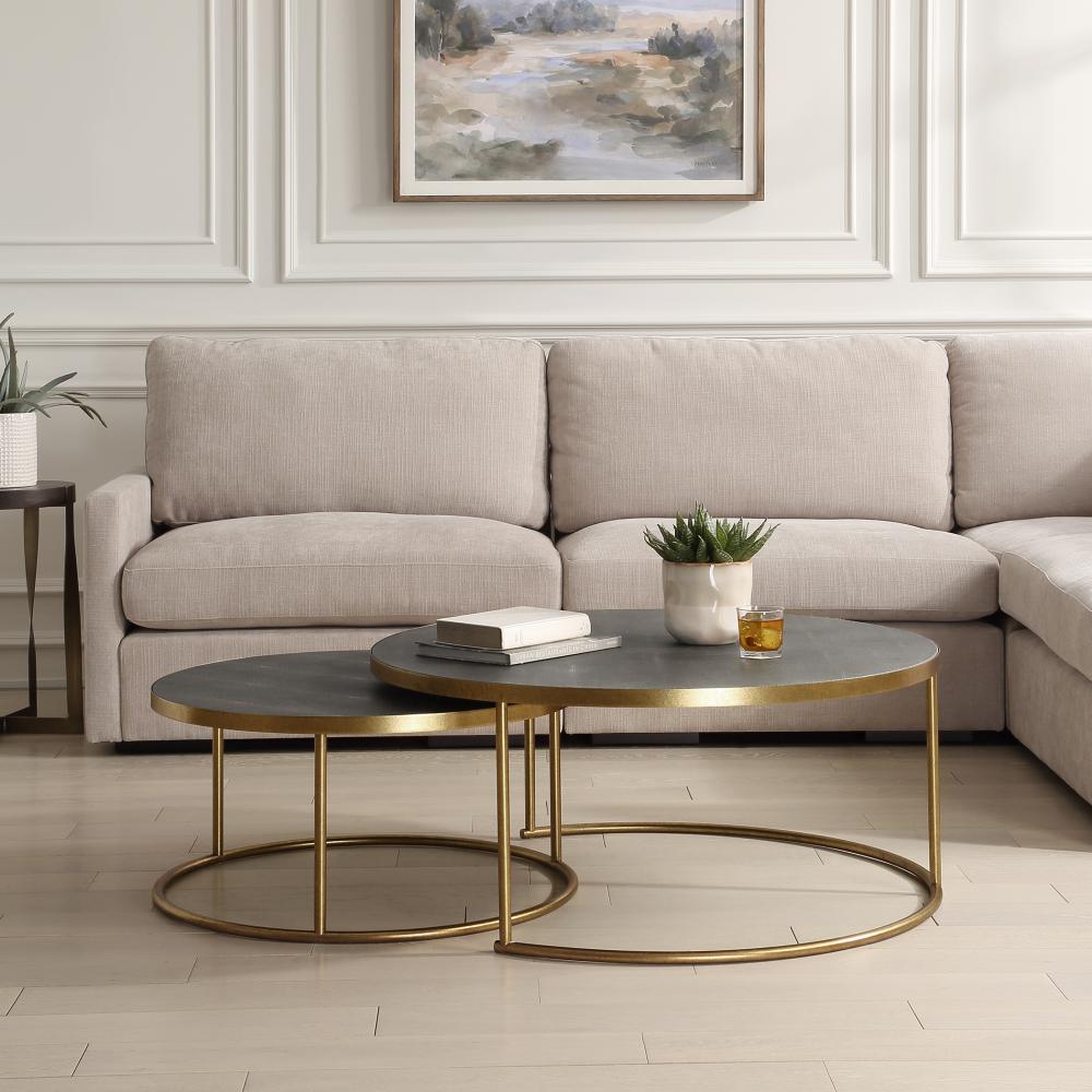 This Set Of Two Functional Nesting Tables Are Constructed With Metal Bases Finished In An Antique Burnished Brass With Faux Gray Shagreen Wrapped Tops.
