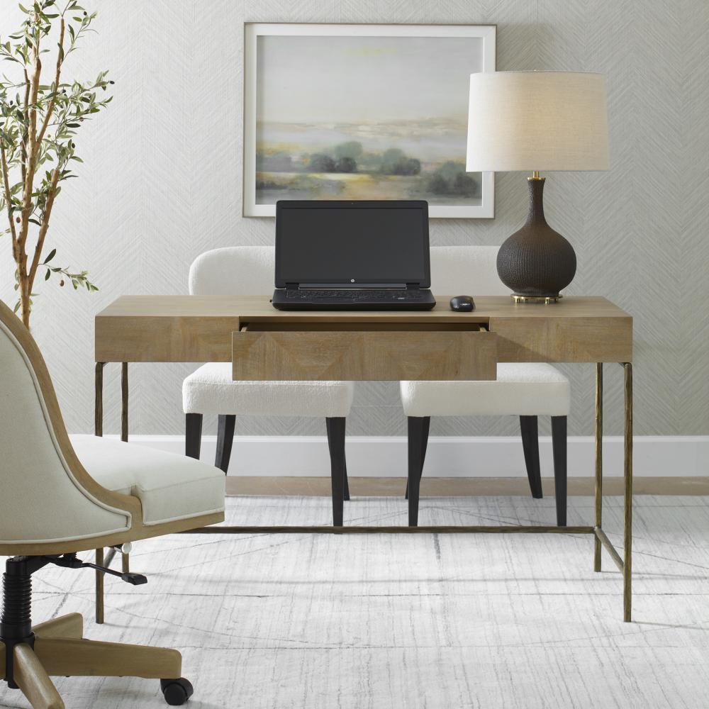 The Aristotle Desk Provides Any Room With A Clean-lined Contemporary Work-space. Finished In A Vibrant Primavera Wood Veneer With A Natural Finish And A Sturdy Antique Gold Cast Iron Base, This Desk Is The Perfect Blend Of Warm And Rugged Sophistication. Features One Center Storage Drawer.