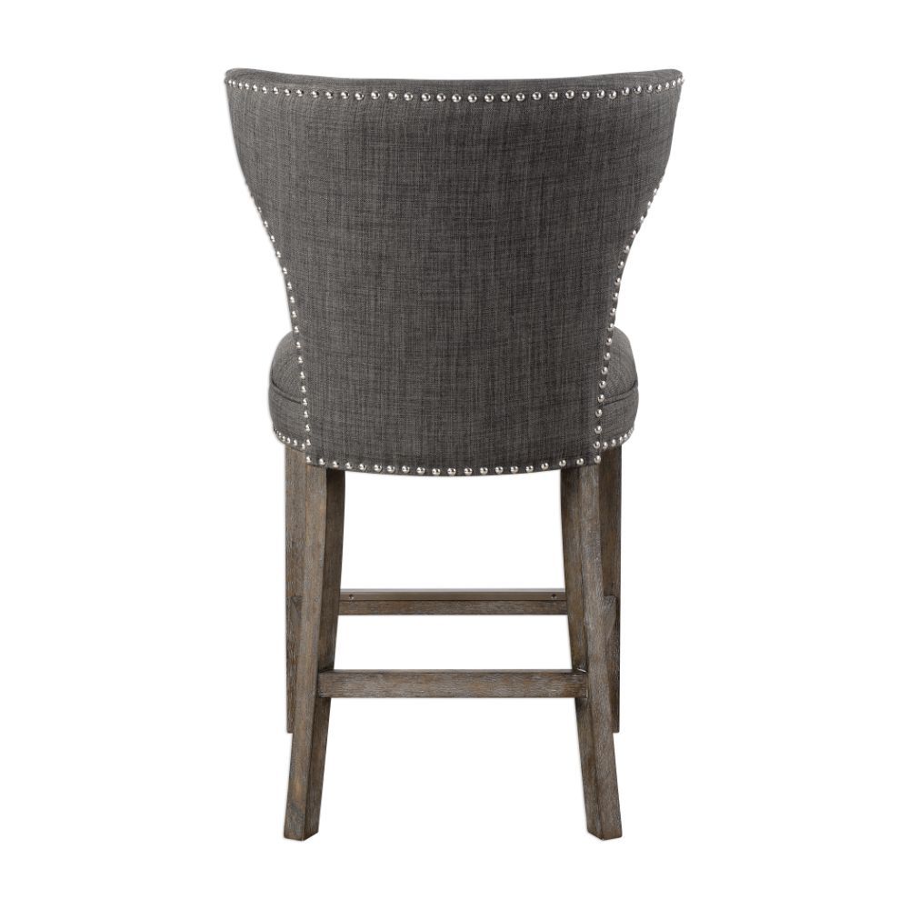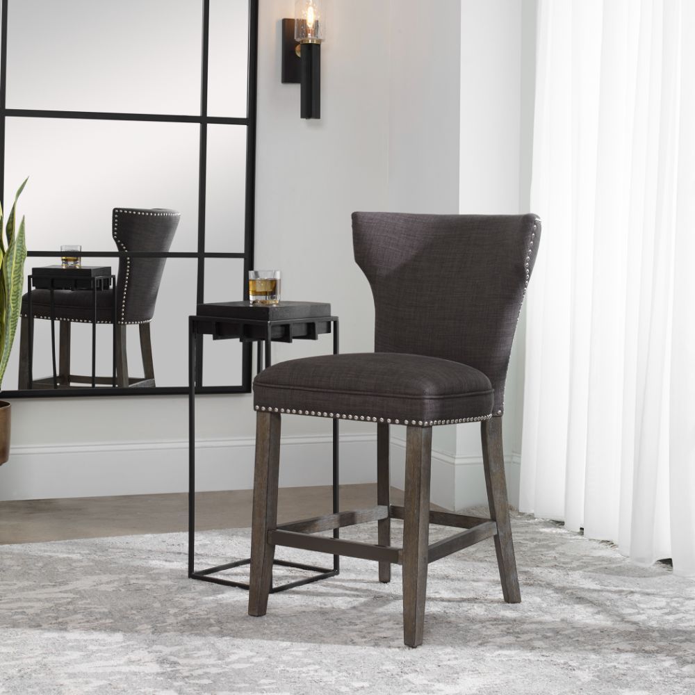 Supportive Comfort in A Curved Back Design, Covered with Warm Charcoal Gray Linen and Accented By Polished Nickel Nail Head Trim. Honey-stained Frame is Finished with Heavy Gray Wash, with An Antique Brass Finished Kick Plate. Seat Height is 25".