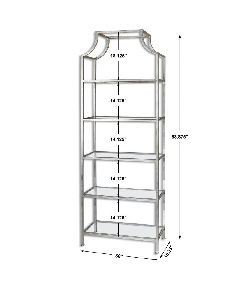 Transitional in Style, This Forged Iron Etagere Features A Bright Silver Leaf Finish with Five Tempered Glass Shelves.
