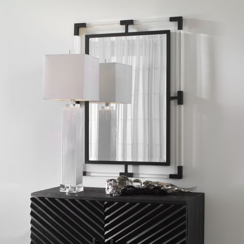 This Mirror Can Certainly Serve As A Focal Point for Any Room. Combining Forged Iron Finished in Matte Black, with Suspended, Clear Acrylic, Solid Bars Creating A Modern Feel. Mirror Has A Generous 1 1/4" Bevel and May Be Hung Horizontal or Vertical.