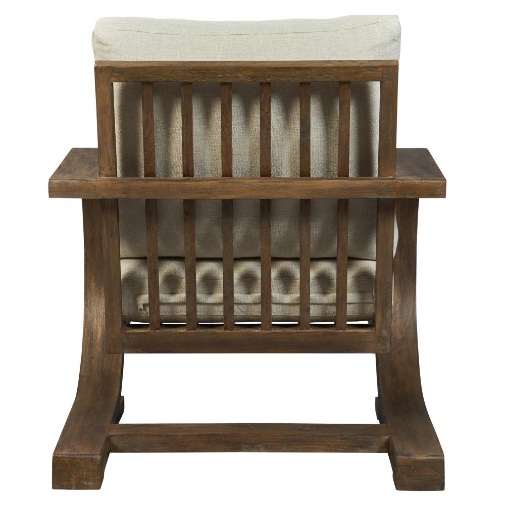 With Art Deco Roots and Transitional Updates, The Dramatic Arm Gives Flexible Movement in Solid Mango Wood Finished in Weathered Pecan with A Gray Wash. with A Ladderback Design and Comfortable Box Cushions Upholstered in A Neutral Polyester. Seat Height is 19".