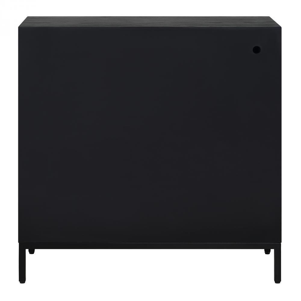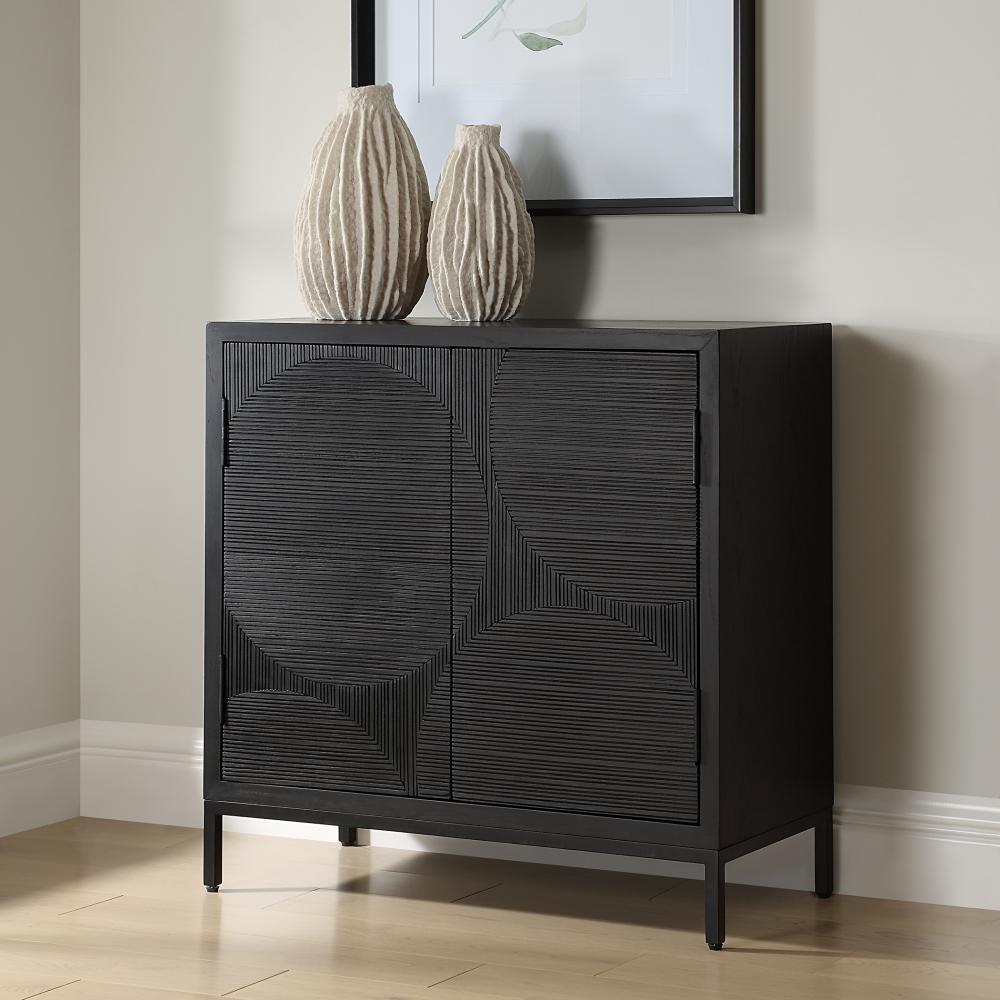 This Cabinet Features A Stylish Carved Circle Pattern In A Chic Black Matte Finish, Giving The Cabinet An Unique Elegance. Push To Open Doors, Oak Grain, And A Thin Raised Metal Base Complete This Contemporary Look.