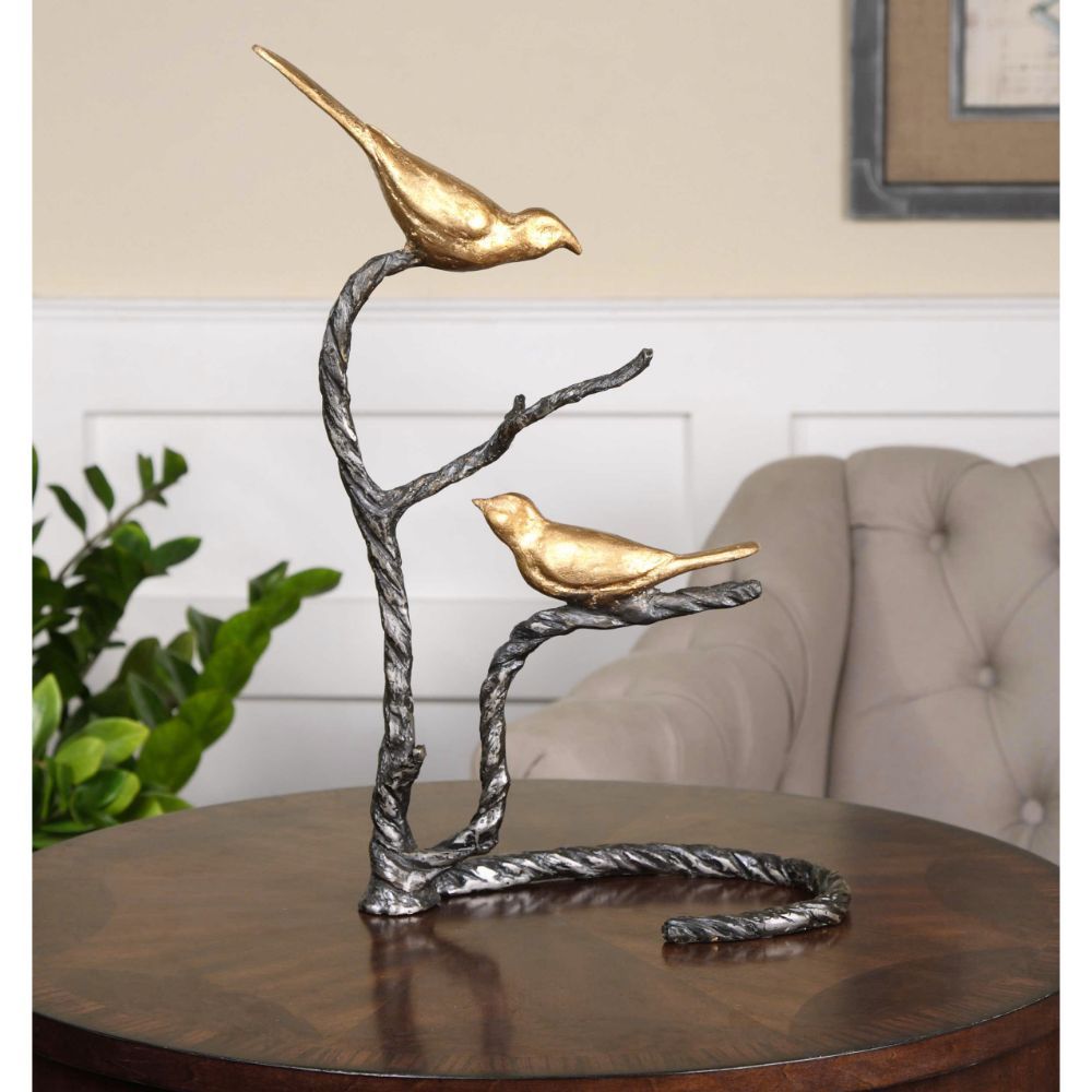 A Sculpture Featuring Twisted Wrought Iron Tree Limbs with Bright, Metallic Gold Birds.