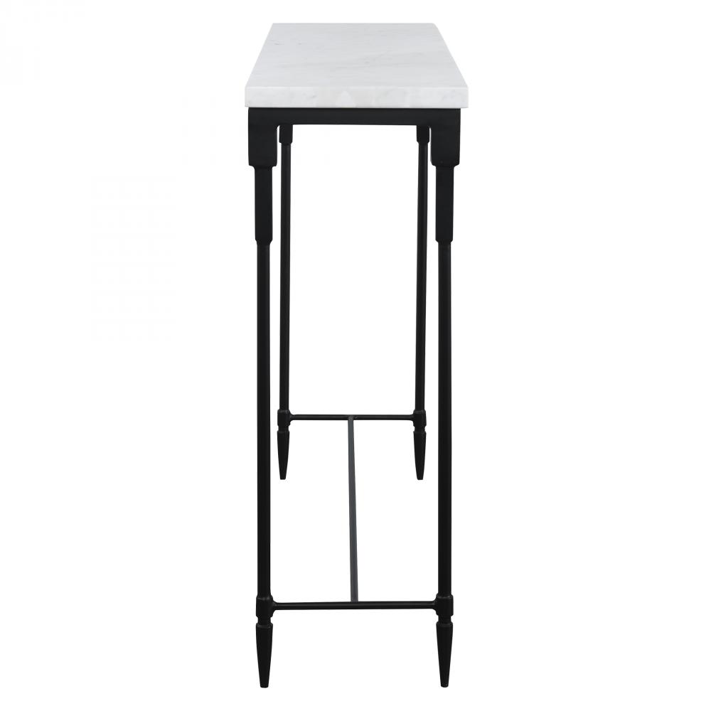 A Classic Black and White Combination with Transitional Style, The Bourges Console Table Features A Honed White Marble Slab Top with An Iron Base in Satin Black. Because of The Natural Characteristics of Marble, Each Piece Will Have Unique Veining Patterns.