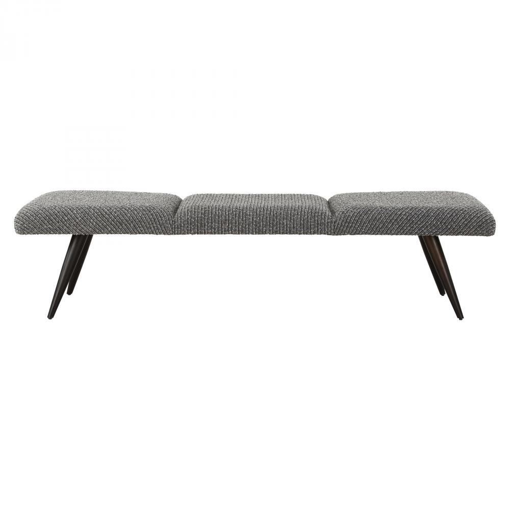 A Classic Bowtie Shape Is Accentuated By The Directional Stripes Of The Polyester Boucle Fabric In Charcoal And Slate Gray Tones. Paired With Tapered Metal Legs In Bronze.