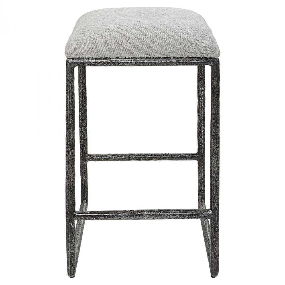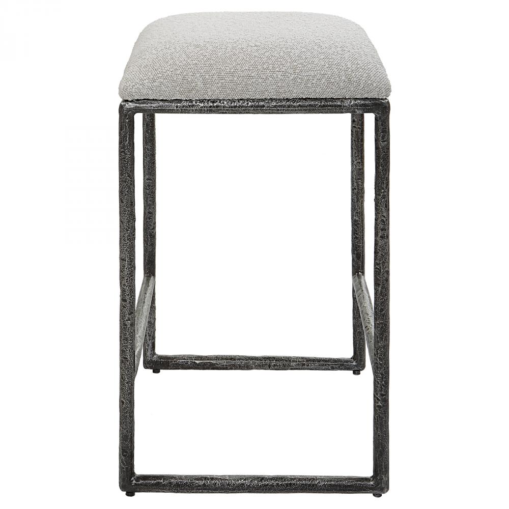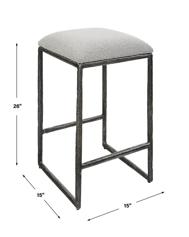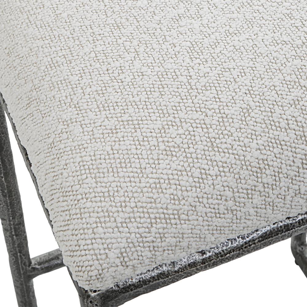 With Clean Contemporary Lines, This Open Frame Design Features A Textured Cast Iron Base in A Natural Distressed Charcoal Finish. Paired with A Tight Upholstered Seat in A Casual Ivory and Warm Gray Boucle Fabric. Seat Height is 26".