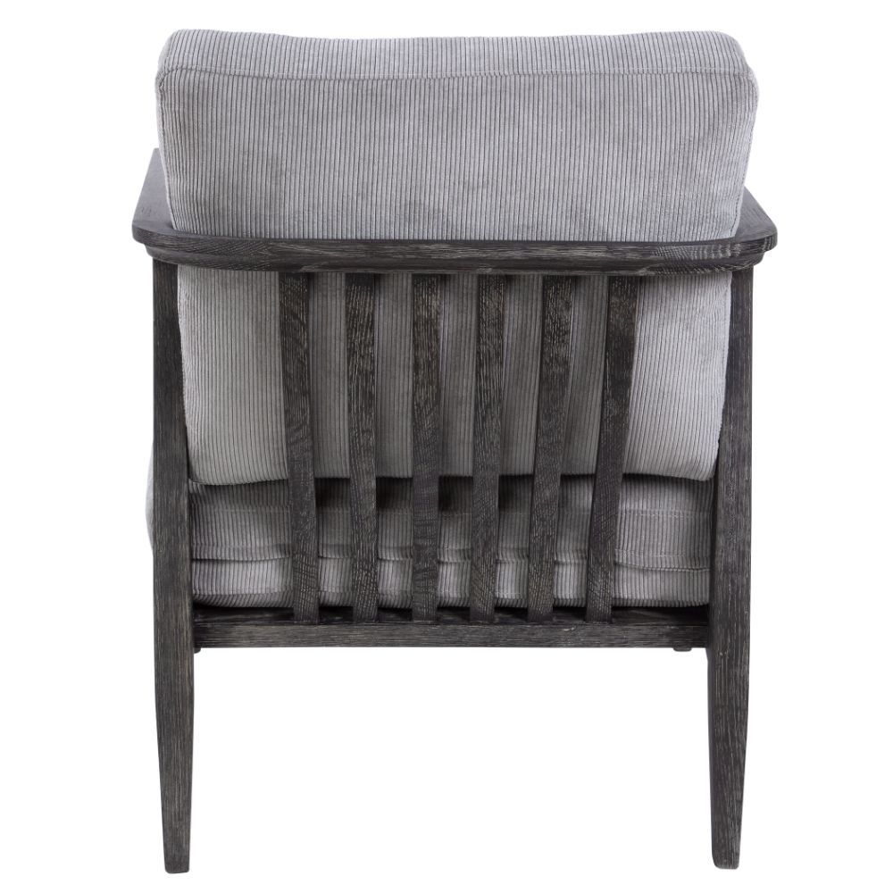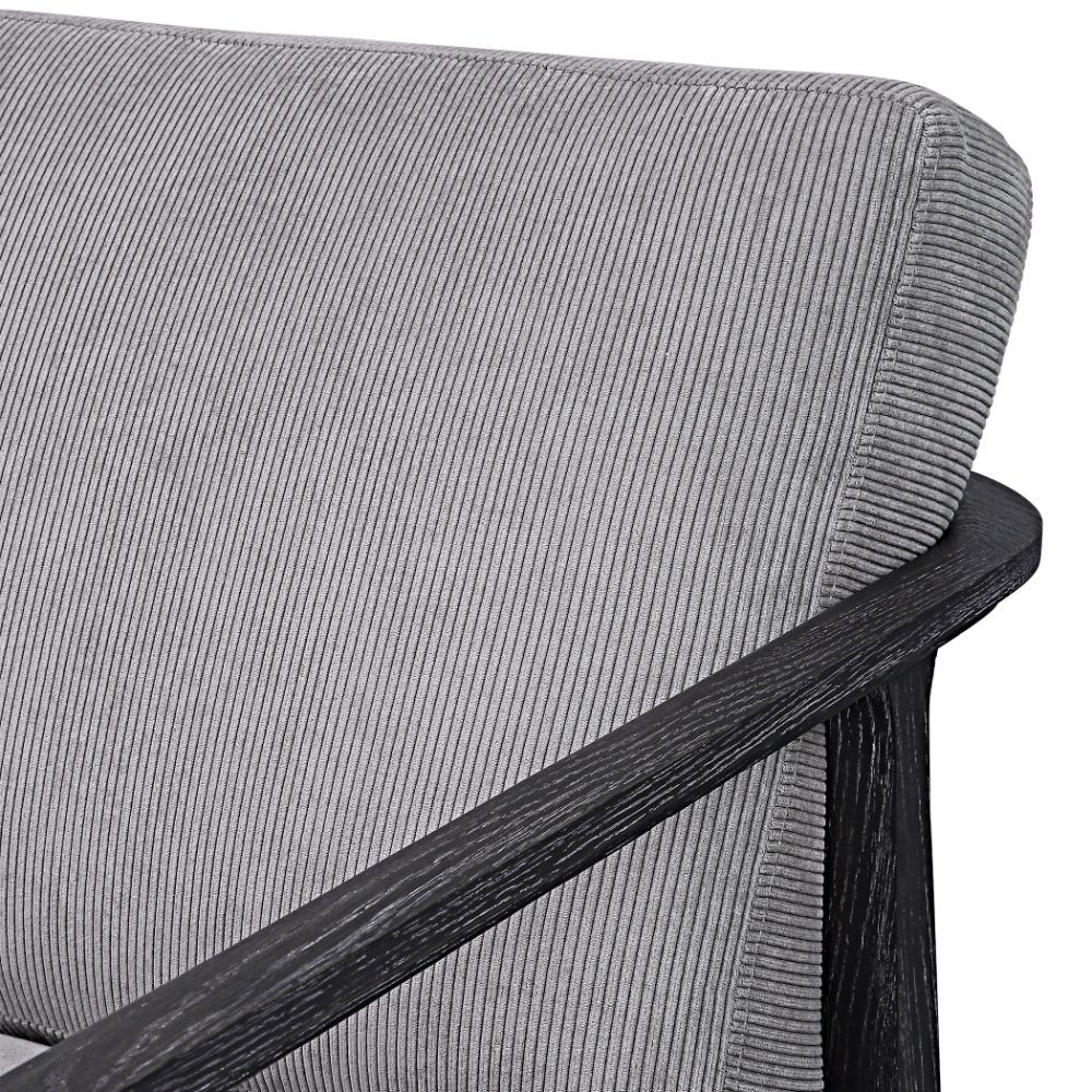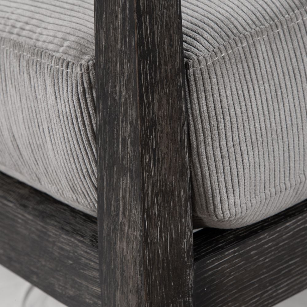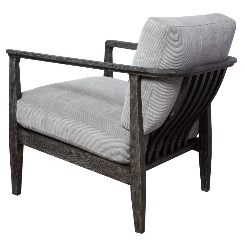 This Refreshing Take on A Modern Accent Chair Features A Curved Open Back Design in Solid Oak Wood. The Dark Ebony Stain Has A Light Gray Glaze Enhancing The Wood Grain. Loose Seat and Back Cushions Are Tailored in A Plush Polyester Channeled Fabric in Steel Gray. Seat Height is 19".