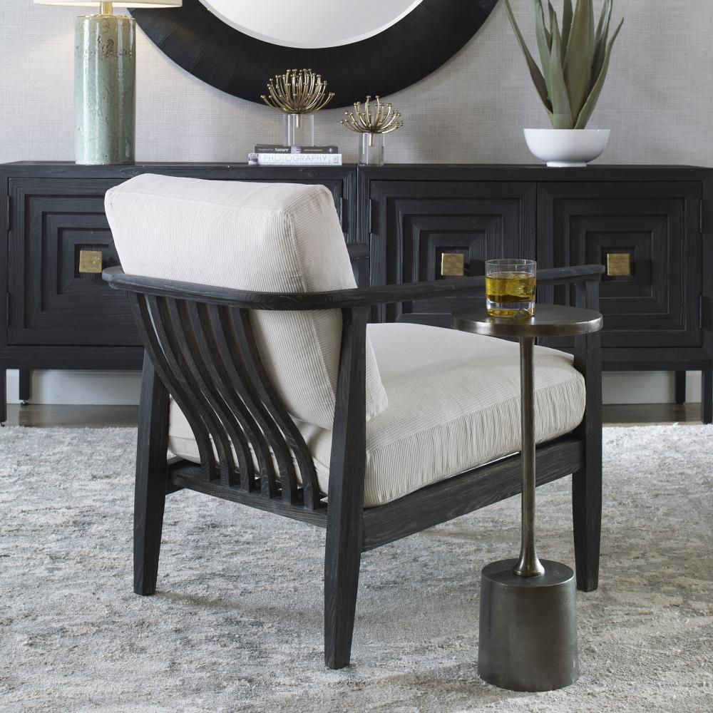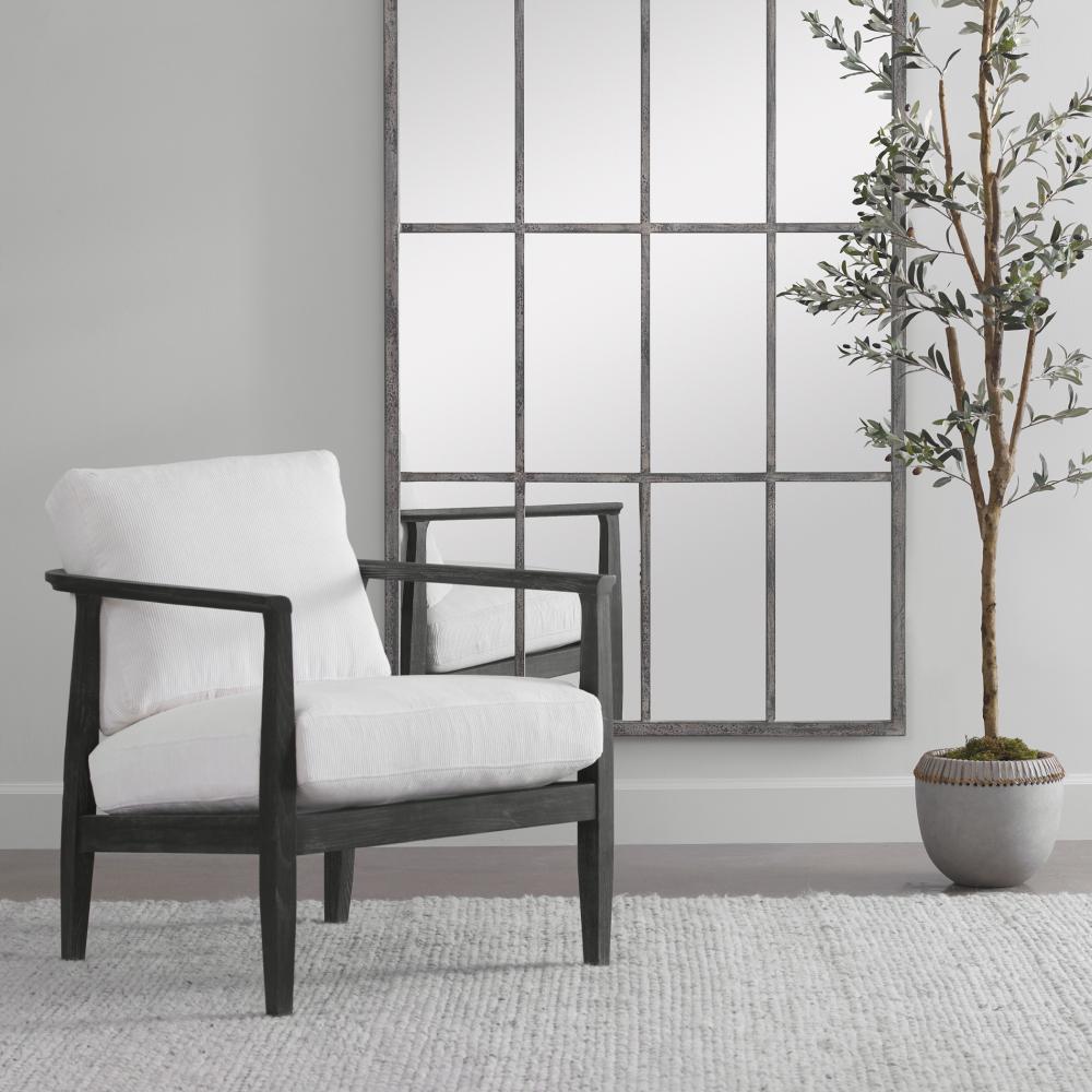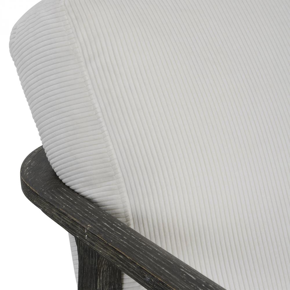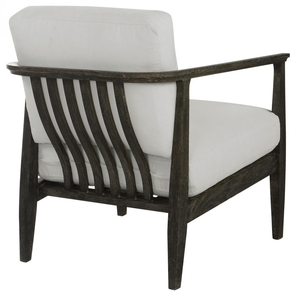 This Refreshing Take on A Modern Accent Chair Features A Curved Open Back Design in Solid Oak Wood. The Dark Espresso Stain Has A Light Gray Glaze Enhancing The Wood Grain. Loose Seat and Back Cushions Are Tailored in A Plush Polyester Channeled White Fabric. Seat Height is 19".