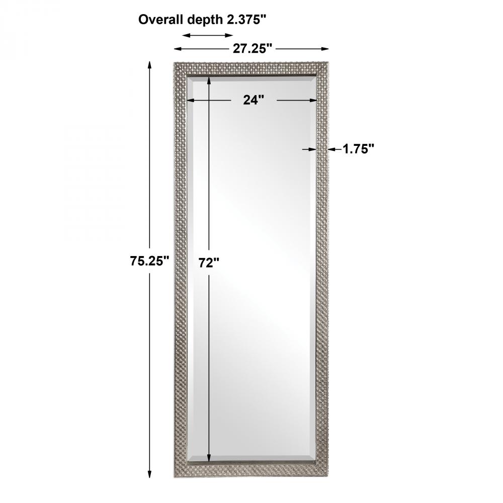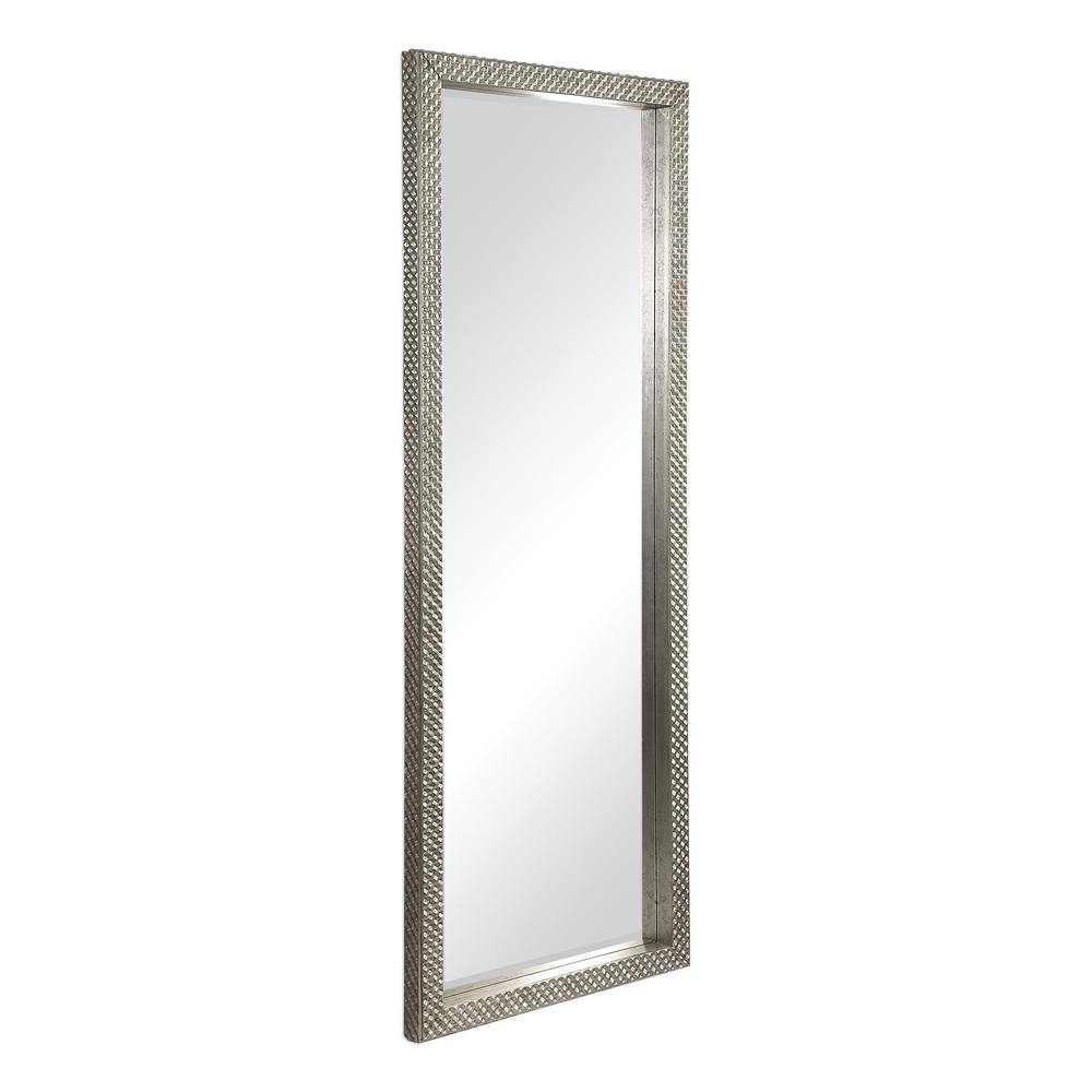 This Leaner Style Mirror Features A Solid Wood Frame Showcasing A Diamond Studded Texture on Face and Outside, Finished in A Lightly Antiqued Metallic Silver. Mirror Features A Generous 1 1/4" Bevel and May Be Hung Horizontal or Vertical.