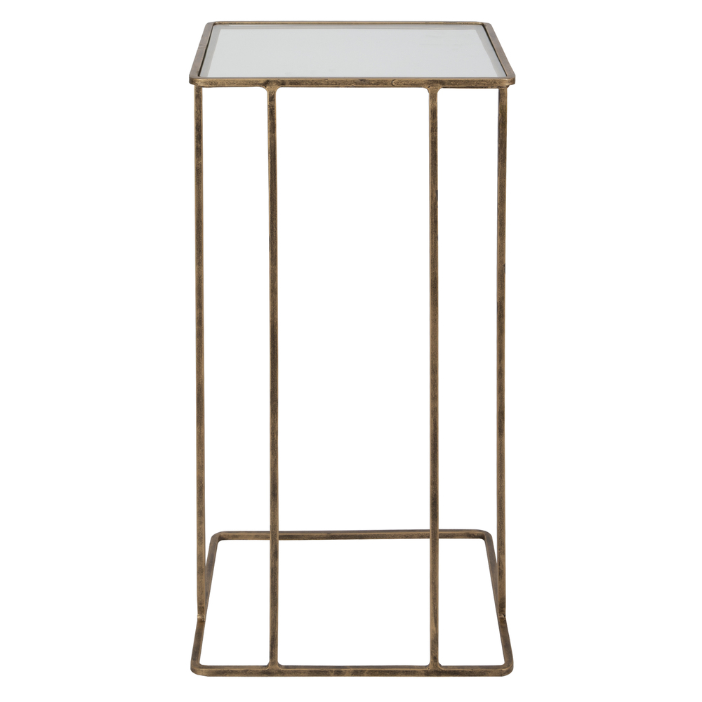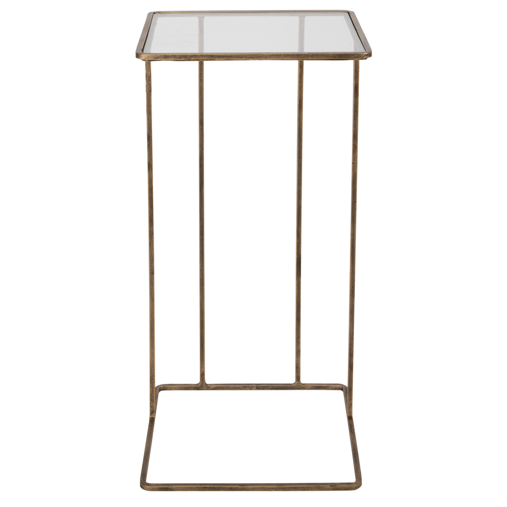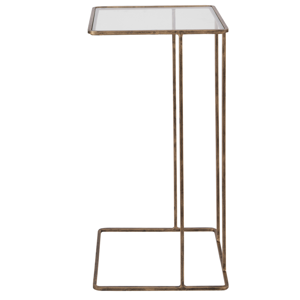 Minimally Designed with Versatility, This Petite Hand Forged Iron Accent Table is Finished in Heavily Antiqued Gold with A Clear Tempered Glass Top.