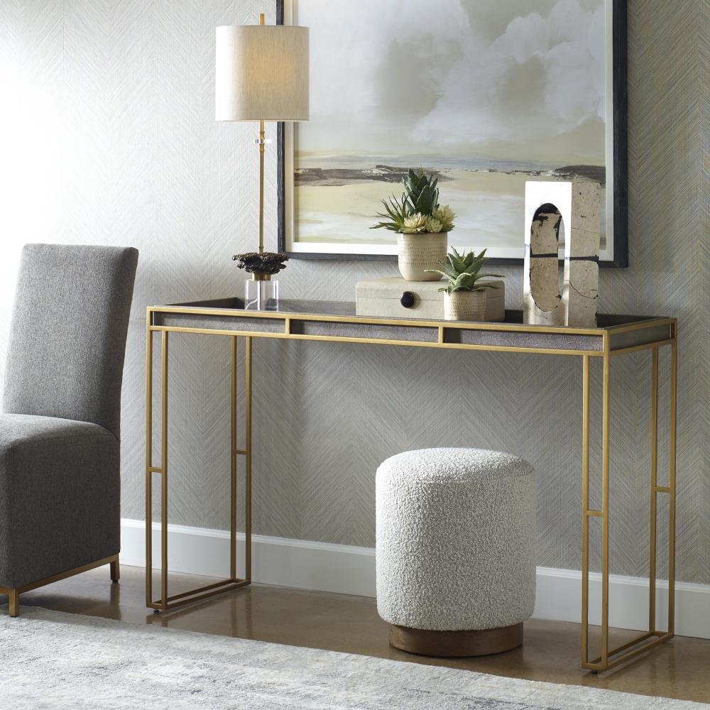 Exhibiting A Modern Minimalist Design, This Tray Style Console Table Features A Rich, Charcoal Gray Faux Shagreen Paired with A Plated Brushed Brass Steel Frame.