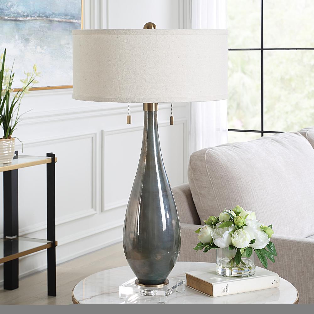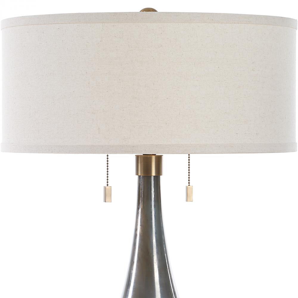 Smoke Gray Glass Featuring Subtle Iridescent Bronze Hues Accented With Plated Brushed Brass Metal Details And A Thick Crystal Foot. The Round Hardback Drum Shade Is A White Linen Fabric With Natural Slubbing.