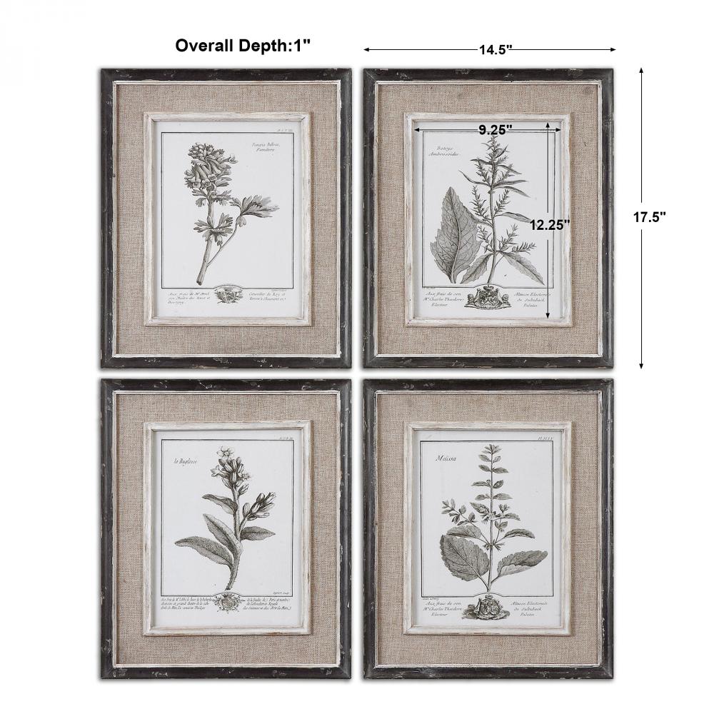 These Botanical Prints Feature A Contemporary Take on An Antique Style. Each Black and White Print is Surrounded By A Light Tan Burlap Mat. The Outer Frames Have A Heavily Distressed Black Finish with A Gray and Taupe Wash. The Inner Lips and Fillets Have A Medium Wood Tone Base with A Heavily Distressed White Painted Finish and A Gray and Taupe Glaze. Each Print is Placed Under Protective Glass.