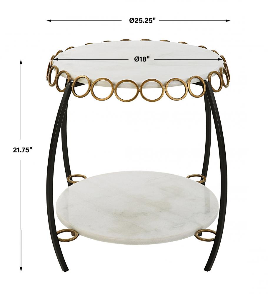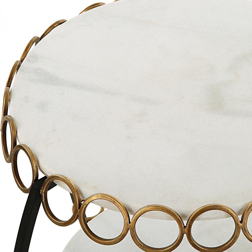 Shelves of Honed White Marble Are Decorated with Antique Gold Ringlets with Gracefully Arched Iron Legs in Matte Black. True to The Nature of Natural Materials, Each Piece Will Have Unique Marbling and Veining Throughout.