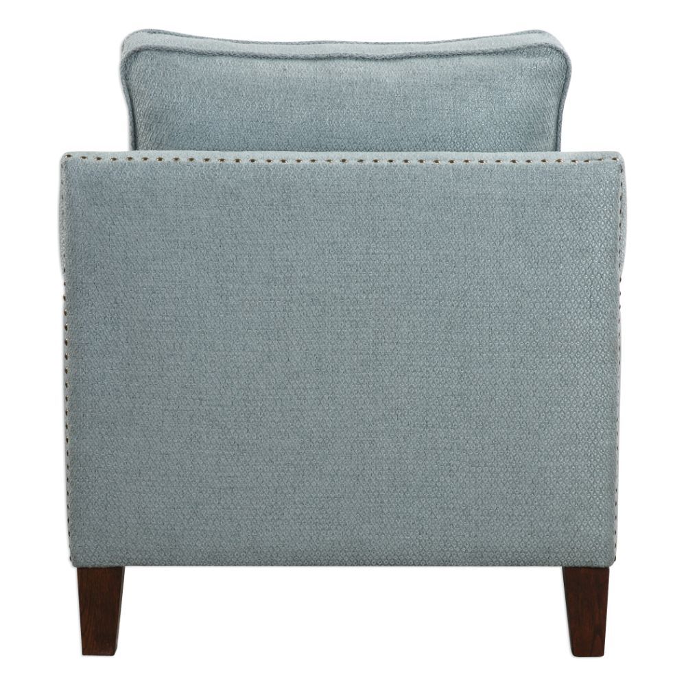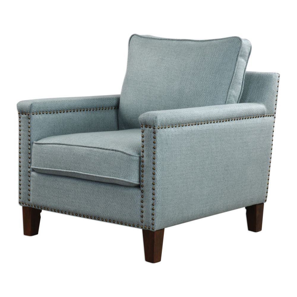 Supportive Comfort in A Transitional Club Chair, with A Subtle Woven Argyle Pattern in Light Sea Mist, Accented with Antique Brass Nail Head Trim on Solid Oak Legs Finished in Dark Walnut. Seat Height is 19".