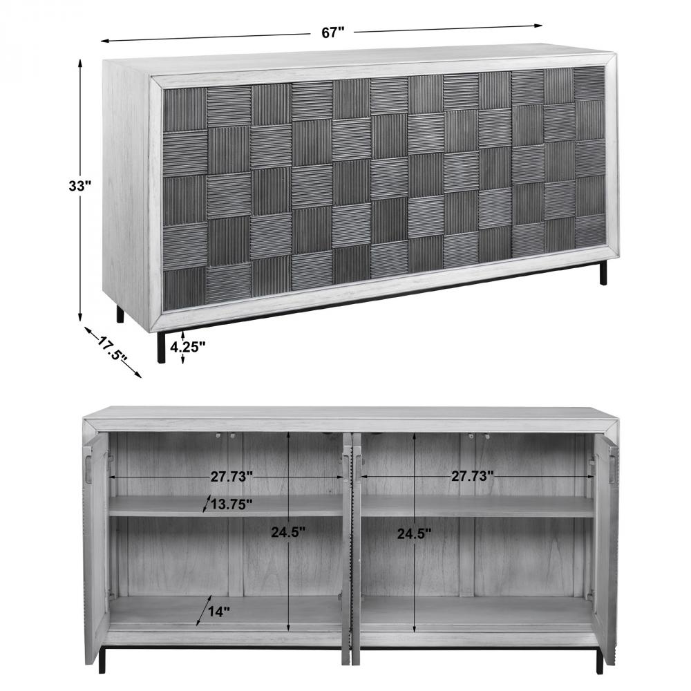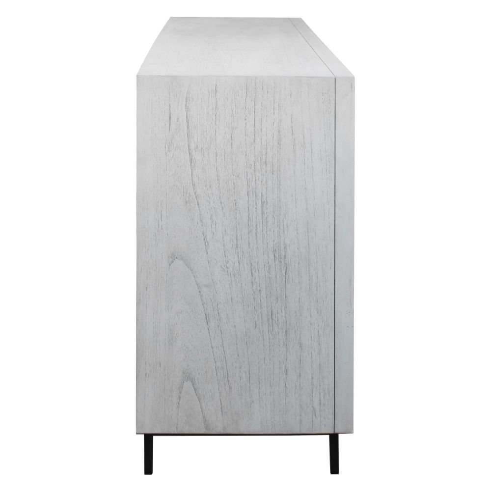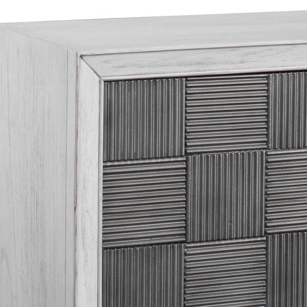 The Perfect Storage Cabinet or The Focal Point of Your Room, This Four Door Cabinet is Constructed From Mahogany Wood in A Whitewashed Finish with Light Gray Distressing. Each Door Features A Reeded Tile Design in A Striking Pewter Gray Tone, with Matte Black Metal Legs. Both Right and Left Sides Open to Reveal One Adjustable Shelf.