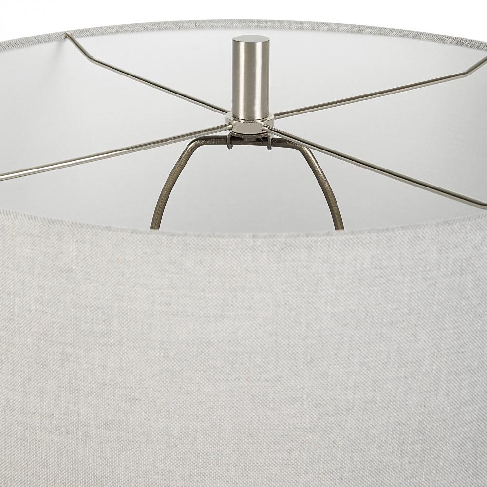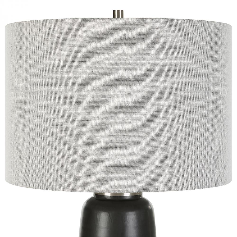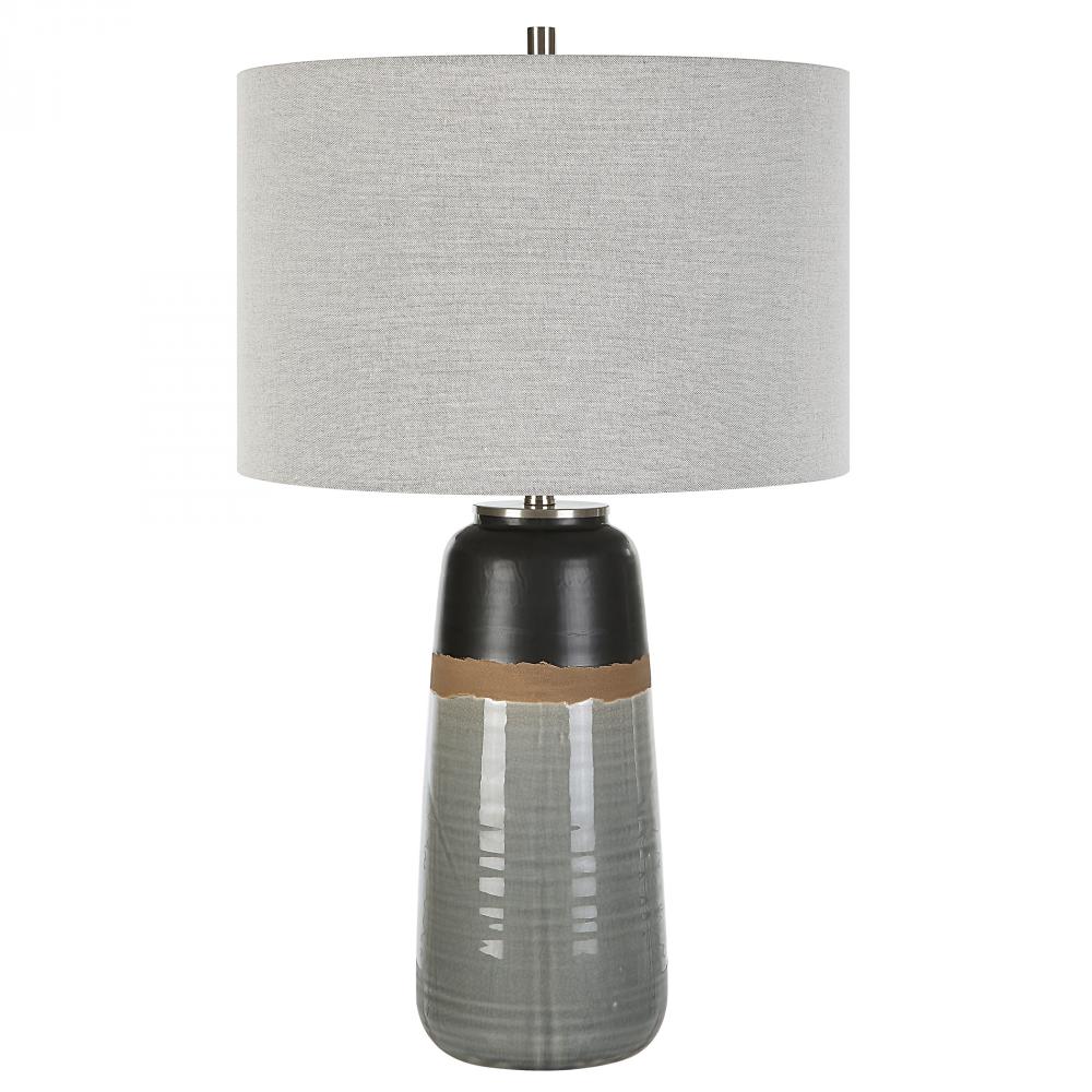 This Ceramic Table Features A Warm Gray and Aged Black Glaze Finish Separated By A Rustic Brown Uneven Band, Accented with Brushed Nickel Details. The Round Drum Shade is Made with A Casual Light Gray Linen Fabric. Due to The Nature of Fired Glazes on Ceramic Lamps, Finishes Will Vary Slightly.