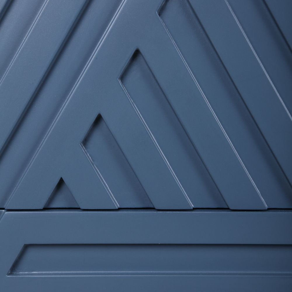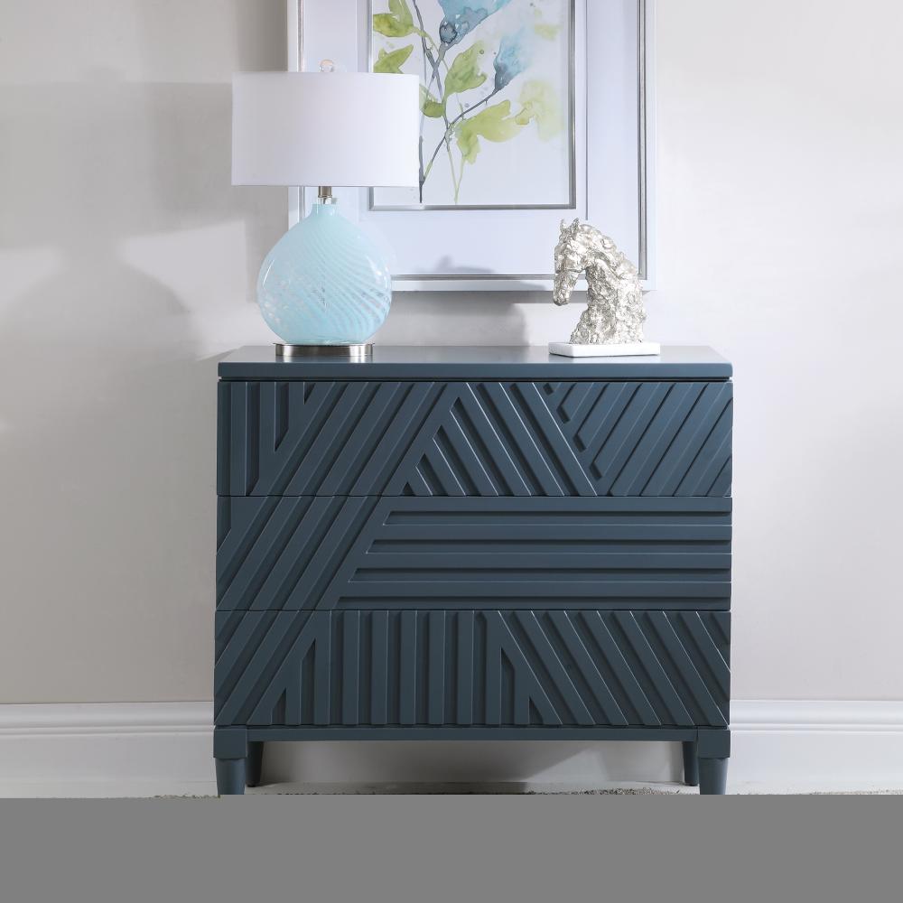 Refreshingly Modern, This Geometric Accent Chest Features Carved Drawer Fronts, Creating A Monochromatic Statement in A Deep Sea Blue Finish.