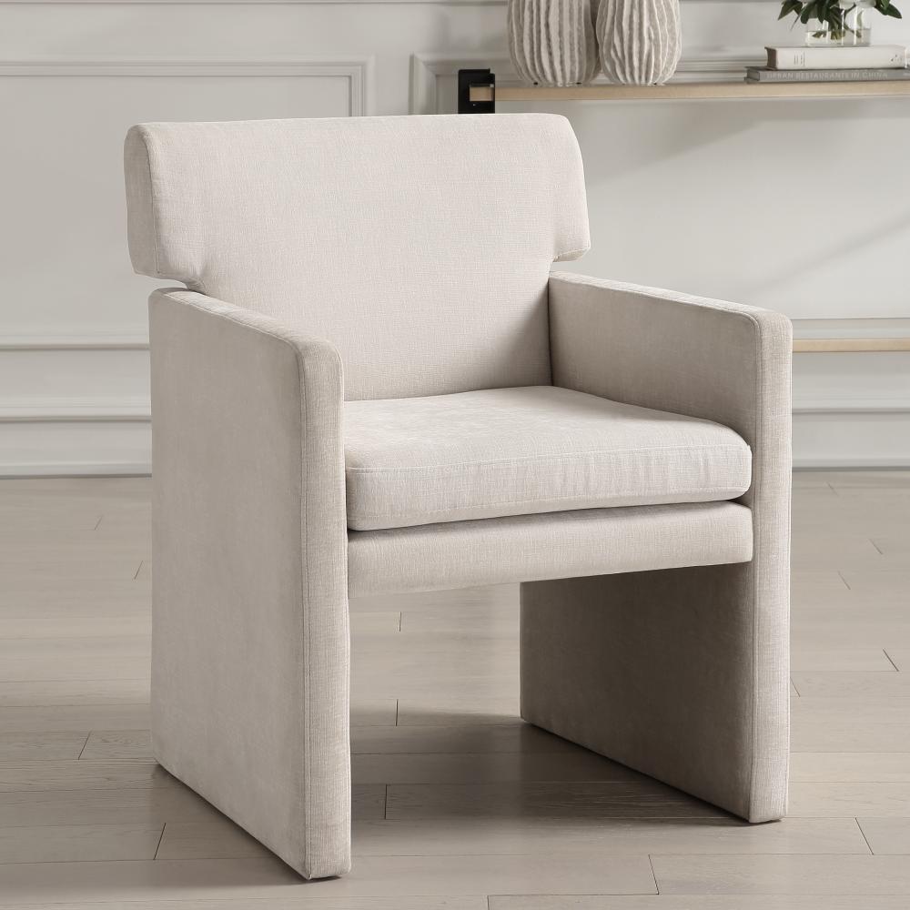 An Elegant And Clean-lined Dining Chair, Perfect Used As The Host And Hostess Seat, Featuring An Elevated Back Design. Fully Upholstered In An Ivory Polyester Velvet With Crosshatched Texturing.