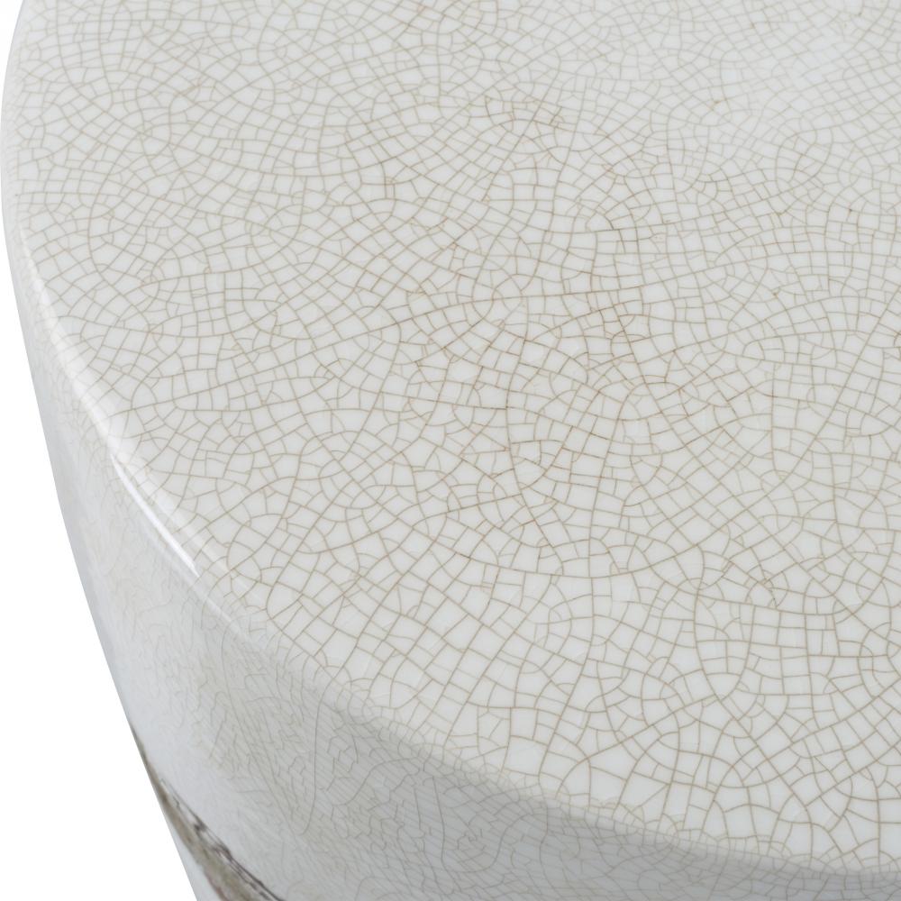 Showcasing A Rustic Casual Look, This Ceramic Garden Stool Features An Off-white Crackle Glaze with Distressed Rust Brown Details and Noticeable Ribbed Texture. May Be Used Outdoors, But Protection From Freezing Temperatures is Recommended.