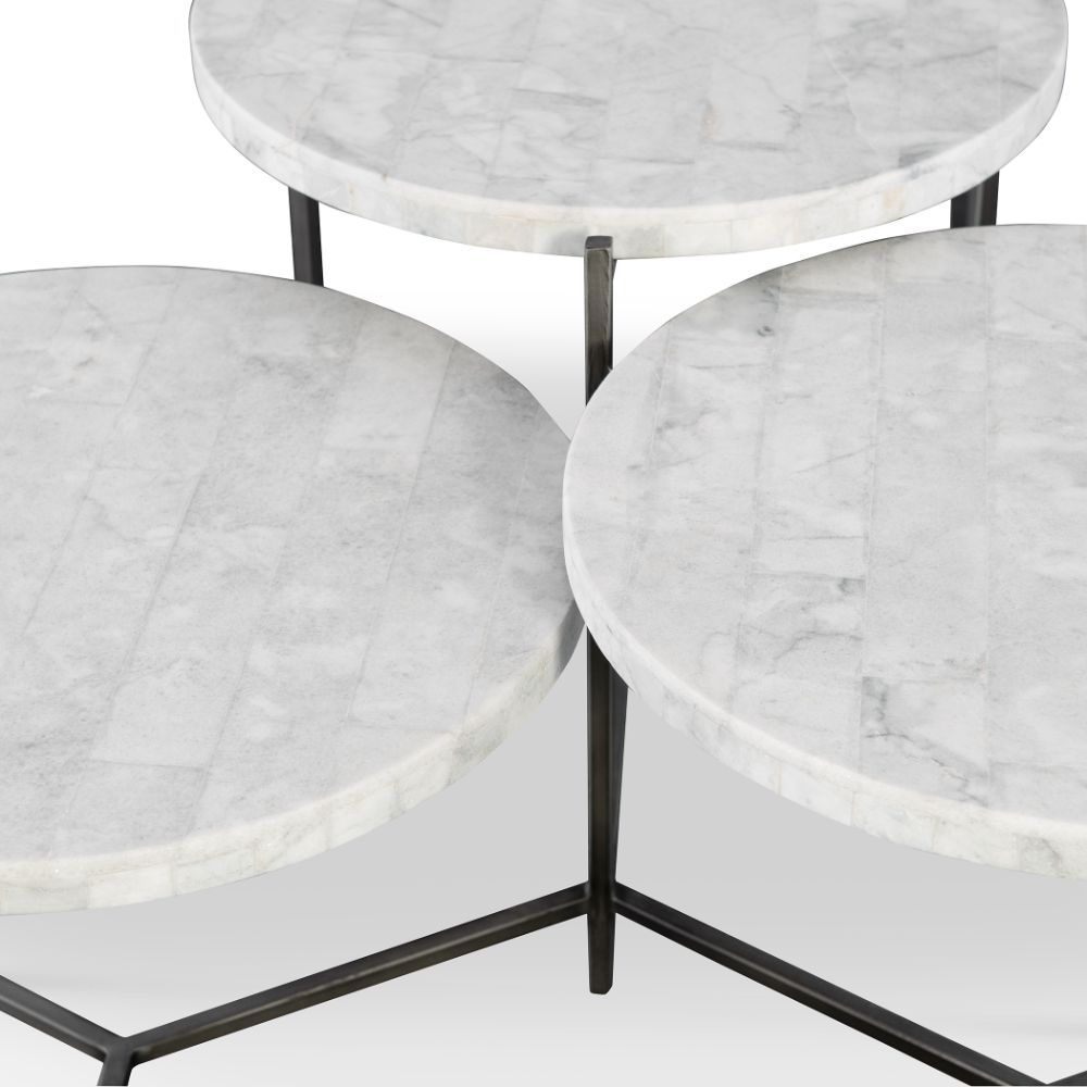 Clean Contemporary Styling is Featured in This Tiered Coffee Table Design with White Marble Tops, on A Forged Iron Base in A Gunmetal Silver Finish.