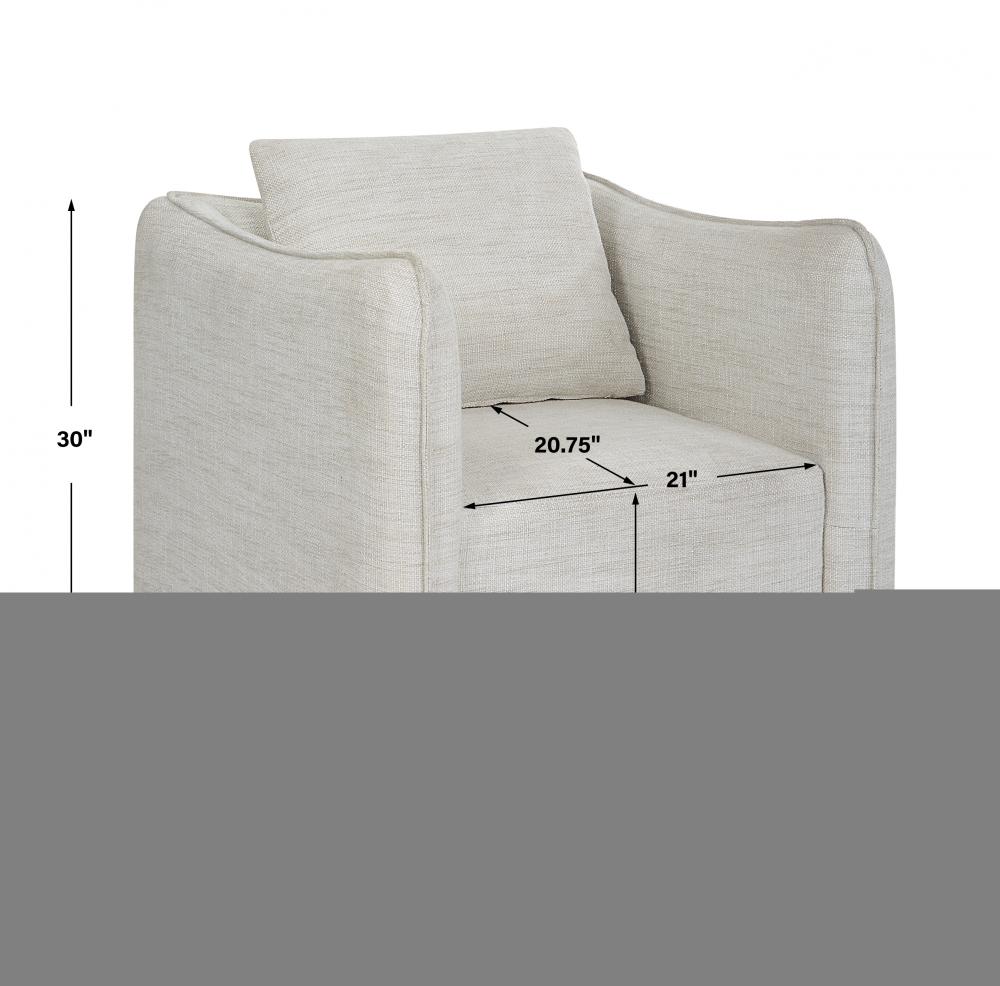 Casual Shelter Arm Accent Chair Tailored in A Woven Linen Blend Fabric in Off-white, Featuring A Flanged Edge Trim Complete with A Loose Back Pillow. Rests on A Solid Birch Wood Swivel Base, Finished in A Weathered Gray Stain. Seat Height is 19"