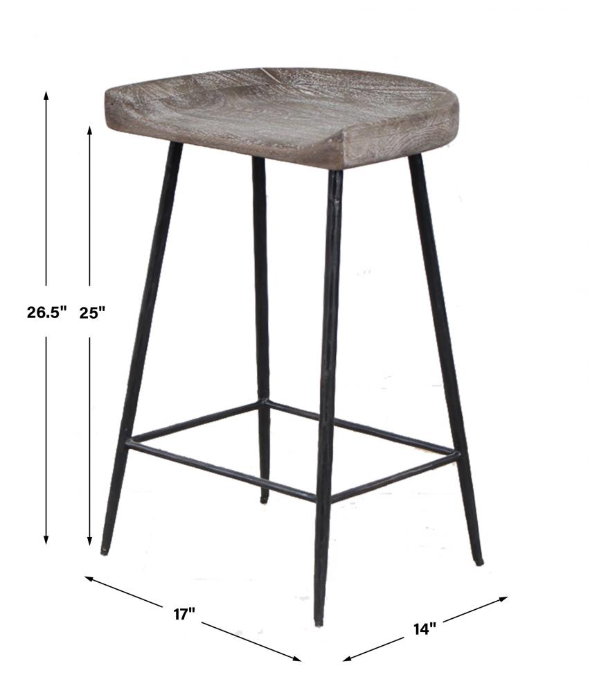 The Cordova Counter Stool is Solidly Constructed with Solid Iron Tapered Legs in Satin Black Supporting A Carved Mango Wood Seat Finished in A Driftwood Gray Glaze with Ivory Ceruse. Seat Height is 25".