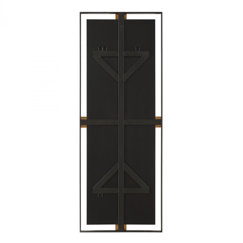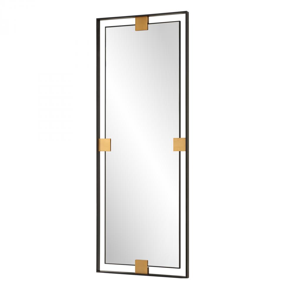 The Cornerstone Mirror, Oversized In Stature, Features Plated Brushed Brass Details Surrounded By A Metal, Free-floating Boarder Finished In A Sleek Satin Black. May Be Hung Horizontal Or Vertical.