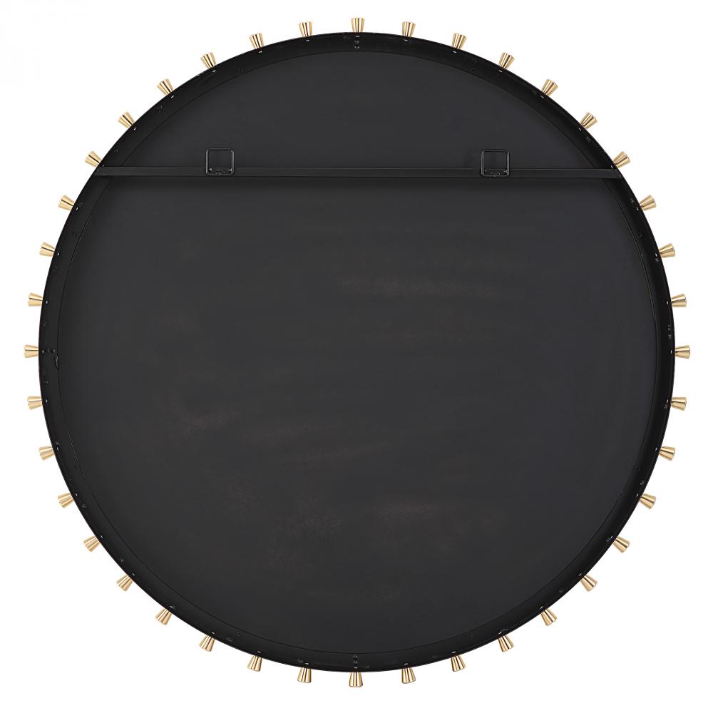 This Modern Round Mirror Features A Iron Frame Finished in Matte Black, Adorned with Brass Plated Tapered Round Pegs Surrounding A Floating Polished Edged Mirror.