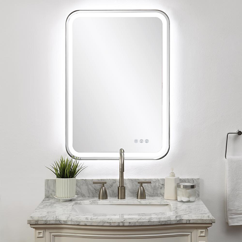 Versatile in Design, This Vanity Mirror Has Integrated LED Lighting That Illuminates Through The Frosted Strip in The Polished Edged Mirror. The Polished Nickel Plated Stainless Steel Frame is Off Set From The Wall to Allow Ambient Lighting From The Back. Easy to Use Touch Buttons Are Featured on The Bottom Right of The Mirror with An on Off Function, Touch and Hold Kelvin Control From 2700k to 4000k, and Touch and Hold Brightness Control. LED Lights Rated At 40,000 Hours. Ships with Plug, But Can Be Hardwired Professionally. Touch Screen Icons Continue to Illuminate When Powered Off for Easy Navigation in Dark Settings.