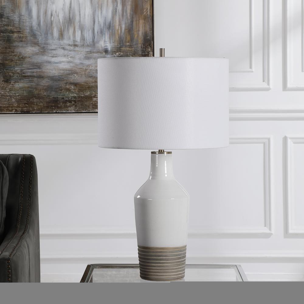 This Ceramic Lamp Features A White Crackle Glaze Finish Paired with A Ribbed Textured Bottom Half Finished in An Aged Terracotta Tone, Accented By Light Antique Brushed Brass Details. A Simple White Linen Fabric Drum Shade Complements The Piece.
