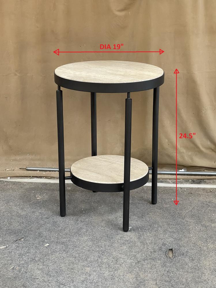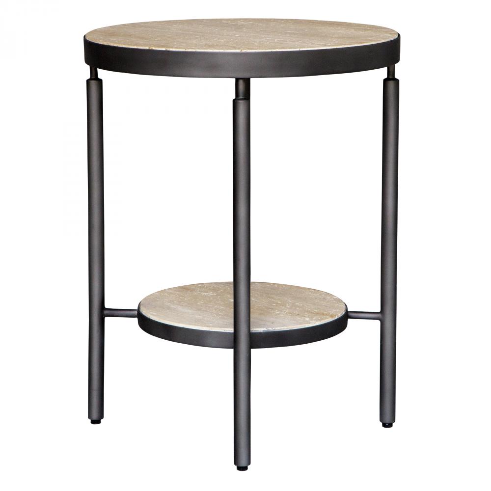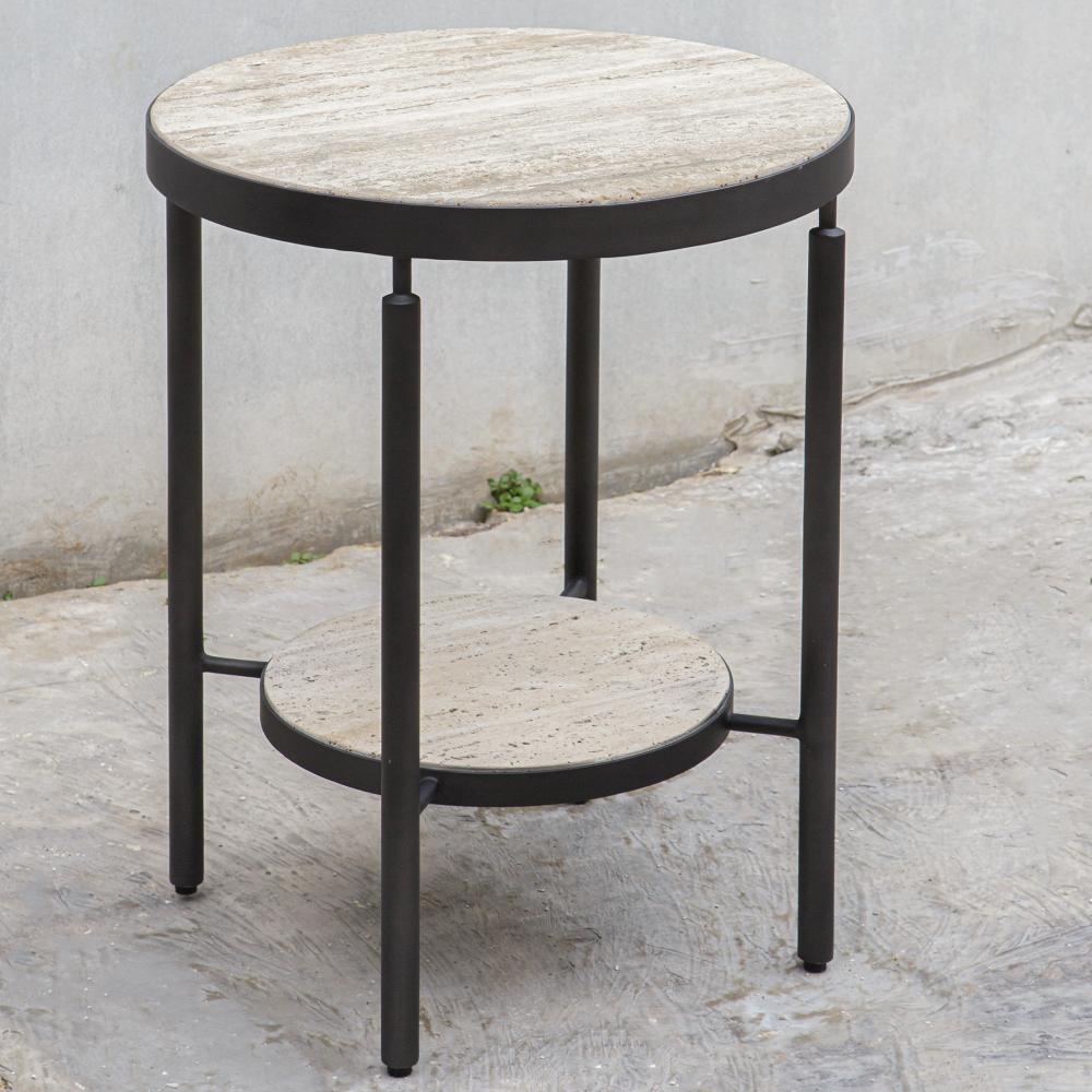 Perfect for Contemporary or Industrial Interiors The Dauntless Side Table Features Two Beautiful Honed and Unfilled Travertine Shelves Suspended By A Matte Black Metal Frame. True to The Nature of Natural Materials, Each Piece Will Have Unique Marbling and Veining Throughout.