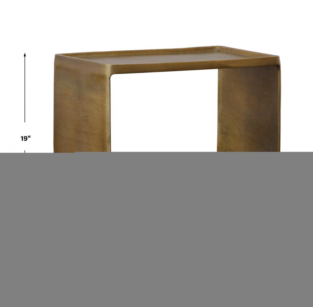 Taking Inspiration From Industrial Style, This Cast Aluminum Accent Table Features A Classy Look with A Tray Style Top in A Rich Antique Brass Finish. The Open Center Allows for Extra Display Space.