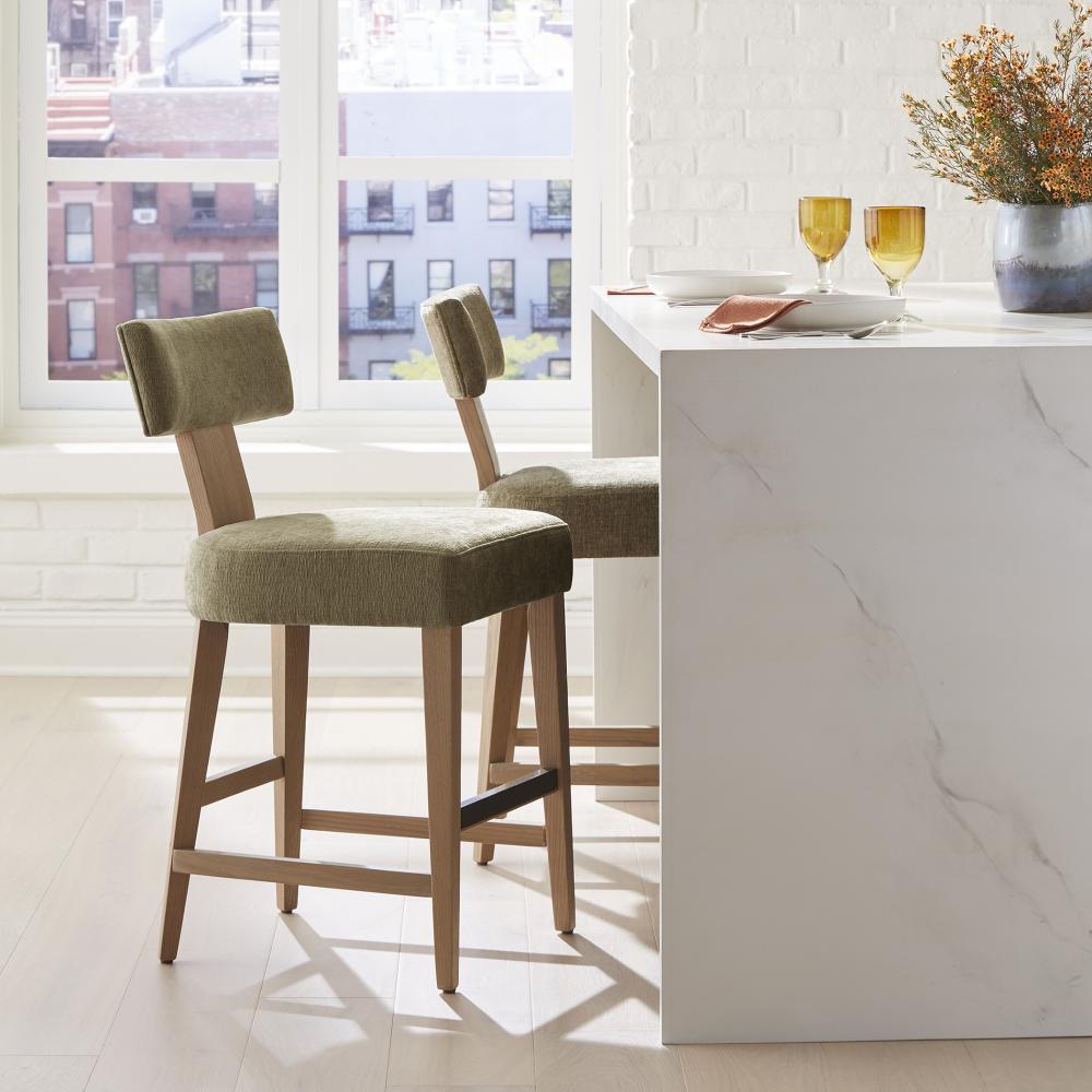 A Classic Klismos Style With A Casual Twist Featuring A Floating Back, Paired With Solid Oak In Natural With A Dark Bronze Kickplate. Upholstered In A Finely Textured, Cleanable Polyester In Moss With A Toxin-free, Eco Friendly Treatment To Help Resist Water Based Stains.